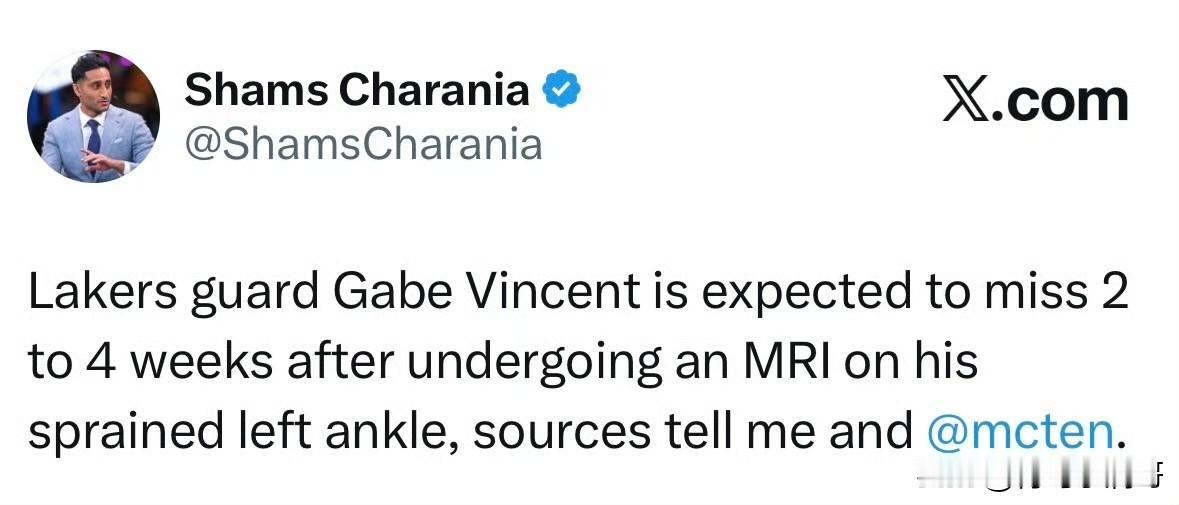 诈骗犯又伤了!!!文森特左脚踝扭伤,将缺阵2-4周 根据记者Shams最新消息