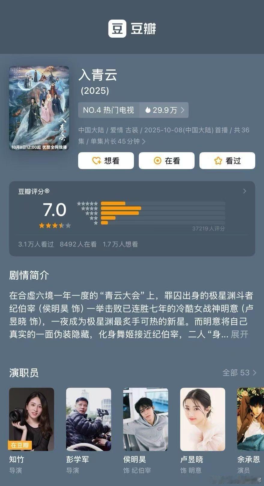入青云豆瓣开分7.0入青云豆瓣7.0分,给了这部剧一个起点,但好剧就是耐得住二
