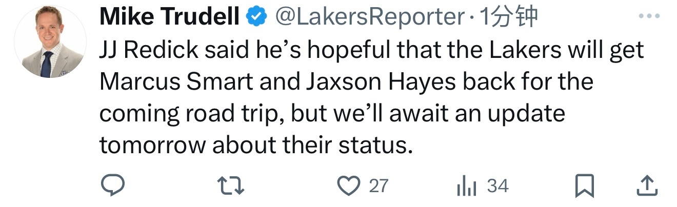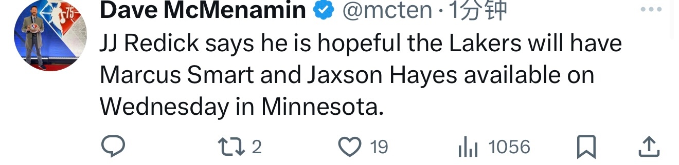 雷迪克表示,他希望下一场打森林狼,能够迎回斯玛特和海斯,但具体状况还需等待明日更新。
