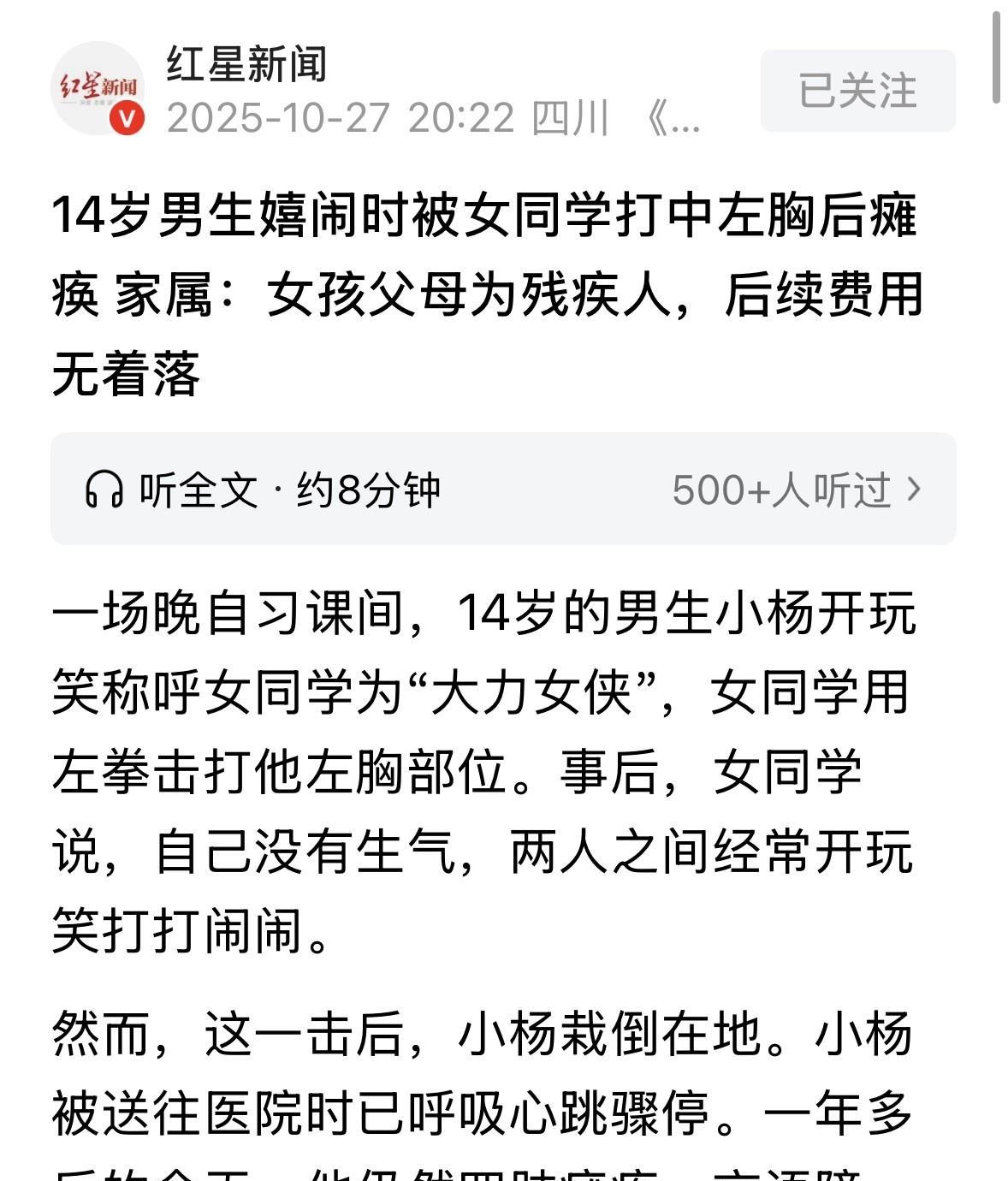 山东临沂,14岁男孩和女同学开玩笑打闹,被对方一拳打在左胸上,男孩当场倒地不起,一老师两次路过都没放在心上,没有采取任何急救措施,15分钟后,男孩才被送往医院,一年时间过去,男孩依旧瘫痪在床,治疗至今花了71万,事后法院判学校担责70%,女同学担责20%,然而,男孩一家虽然赢了判决,赔偿款却迟迟没有着落。 2024年5月21号,某中学的楼道里,14岁的小杨正和同班女生说说笑笑。 两人常开玩笑打闹,这次小杨依旧用开玩笑的口吻,随口对着女生说了句“大力女侠”,女生听后比划着要打小杨。 小杨本能地抬手防守,女生突然重重一拳砸在他左胸口。 小杨瞬间捂着胸口蹲下,紧接着脸朝下栽倒在地,再没动弹。 路过现场的物理老师看见后,蹲下来问了句“怎么了”,小杨没回答。 老师接了个电话就走了,后来返回瞥了眼小杨,又进教室转了一圈再次离开。 4分钟后,看着小杨倒在地上久久缓不过来,也没什么反应,其他同学连忙喊来另一位老师,这位老师掐了小杨人中,小杨才有了点吸气反应。 意识到问题的严重性后,老师连忙把小杨抬到自己车上,开车送去了医院,这时距离事发已经过去15分钟。 小杨在送医途中时已经出现尿失禁,抢救36分钟才恢复自主心率,49分钟后心跳才稳定。 医生诊断是呼吸心跳骤停、缺氧缺血性脑病。 从那天起,小杨在五家医院辗转住了303天,到2025年9月出院时,已经四肢瘫痪,不会说话,连吃饭都困难。 事后,小杨爸妈真是觉得天都塌了,他们无法接受,之前一个活蹦乱跳的娃,现在躺在那,连话都说不出。 他们想找学校和女生讨个说法,没想到却在鉴定上卡了壳。 法院委托了好几家鉴定机构,希望能够坚定学校,以及涉事女同学对小杨受到伤害的参与度、因果关系等等。 结果,几家机构都说不受理,要么说“情况太复杂”,要么说“不属于范围”。 一审时,法官审理认为,晚自习下课楼道里学生扎堆打闹,学校却没安排老师巡逻,小杨倒地后,物理老师没打120,没找校医,送医还是老师开车去的,没叫救护车,学校有很大过错。 至于女生家长说的“小杨本身有心脏病”,法院没采信。 因为两家医院的心脏超声都没发现异常,医生说是“短期心肌水肿”,不是先天毛病。 所以,一审法院判定学校需承担7成责任,女生赔2成,由监护人出,小杨自己担1成。 学校不服上诉,但二审依旧维持了原判。 原本以为事情到这里就尘埃落定了,没想到,事儿又卡在了赔偿款的落实上。 之前学校垫了44.6万,保险公司原本要赔50万,结果二审改判后,保险公司只给学校44.6万,给小杨家才5.6万。 小杨爸算了算,他们光前期治疗就花了71万,那位女同学家穷得叮当响,她爸一级残疾,妈是精神病人,靠爷爷奶奶捡破烂和低保过活,之前只凑出1万。 现在二审后保险公司才给5.6万,哪能够?他们为了给娃治病,已经掏空家底,四处借钱了,现在拿到的这点赔偿款,根本不够还,也弥补不上后续治疗的窟窿。 小杨爸妈因为这些事,心力交瘁,孩子现在天天躺床上,康复治疗一天都不能停。可他们没钱了,从今年9月就接回家保守治疗,那些花销大但效果好的治疗也根本做不起。 他们试过网络筹款,目标50万,最后只筹到1.5万,杯水车薪。 记者联系学校,工作人员只说有专人负责这件事,可提供的电话始终没人接。 小杨爸曾和这位“专人”通过话,对方说要申请鉴定,再起诉后续费用,最后补了句:我们服从法院判决。 那么,从法律角度,怎么看待赔偿款不到位的问题? 《保险法》第65条规定:保险人对责任保险的被保险人给第三者造成的损害,可以依照法律的规定或者合同的约定,直接向该第三者赔偿保险金。被保险人怠于请求的,第三者有权就其应获赔偿部分直接向保险人请求赔偿保险金。 责任保险的核心功能在于保障受害第三方的及时救济。 当被保险人,也就是学校,对第三者,也就是小杨负有确定的赔偿责任时,保险公司应优先向第三者支付赔偿金。 二审法院将保险金44.6万元直接返还学校,仅支付小杨5.6万元的做法,实质上违反了“被保险人未向第三者赔偿时,保险人不得向被保险人赔偿”的法定原则。 学校虽垫付了44.6万元医疗费,但该垫付行为并不等同于已履行对小杨的终局赔偿责任,保险公司直接向学校支付该笔款项,导致小杨实际获得的赔偿大幅缩水,与《保险法》保障第三方的立法目的相悖。 对于这件事,你怎么看? 欢迎关注@一案一论 #头号创作者激励计划#