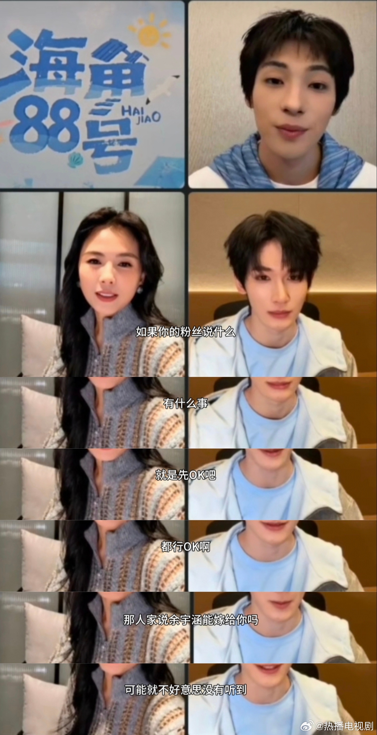 刘涛问余宇涵什么也OK吗余宇涵把“3”的手势看成ok,刘涛问他:粉丝说什么你都答应吗?你都ok吗?”“那你跟网友结婚也ok吗?”谢谢涛姐问了我们想问的[拜托]下次见面就问余宇涵这个问题!海角88号