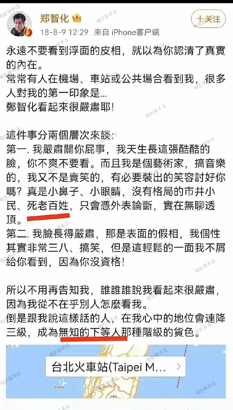 郑智化只是小儿麻痹 不是双腿截肢 他在演唱会上借助拐杖,游刃有余也无人帮扶呀? 怎么没有见他生气的辱骂:“毫无人性?”他一路使用机场提供的轮椅,一路有专人引导,帮助指导进入机舱! 不但没有丝毫感激,反而倒打一耙,辱骂,对所有帮助他的工作人员称“最没有人性,”这也是他的原话! 请问他在全世界其他机场,受到过比深圳机场更有人性化的服务吗?提意见可以,但夸大其词就不应该了! 仗着公众人物的身份肆意抹黑,诋毁,辱骂普通劳动者? 他还认为,安检人员不应该安检他含有金属的鞋,请问金属凭什么不能安检?万一残疾人金属的鞋里有危险物品怎么办?