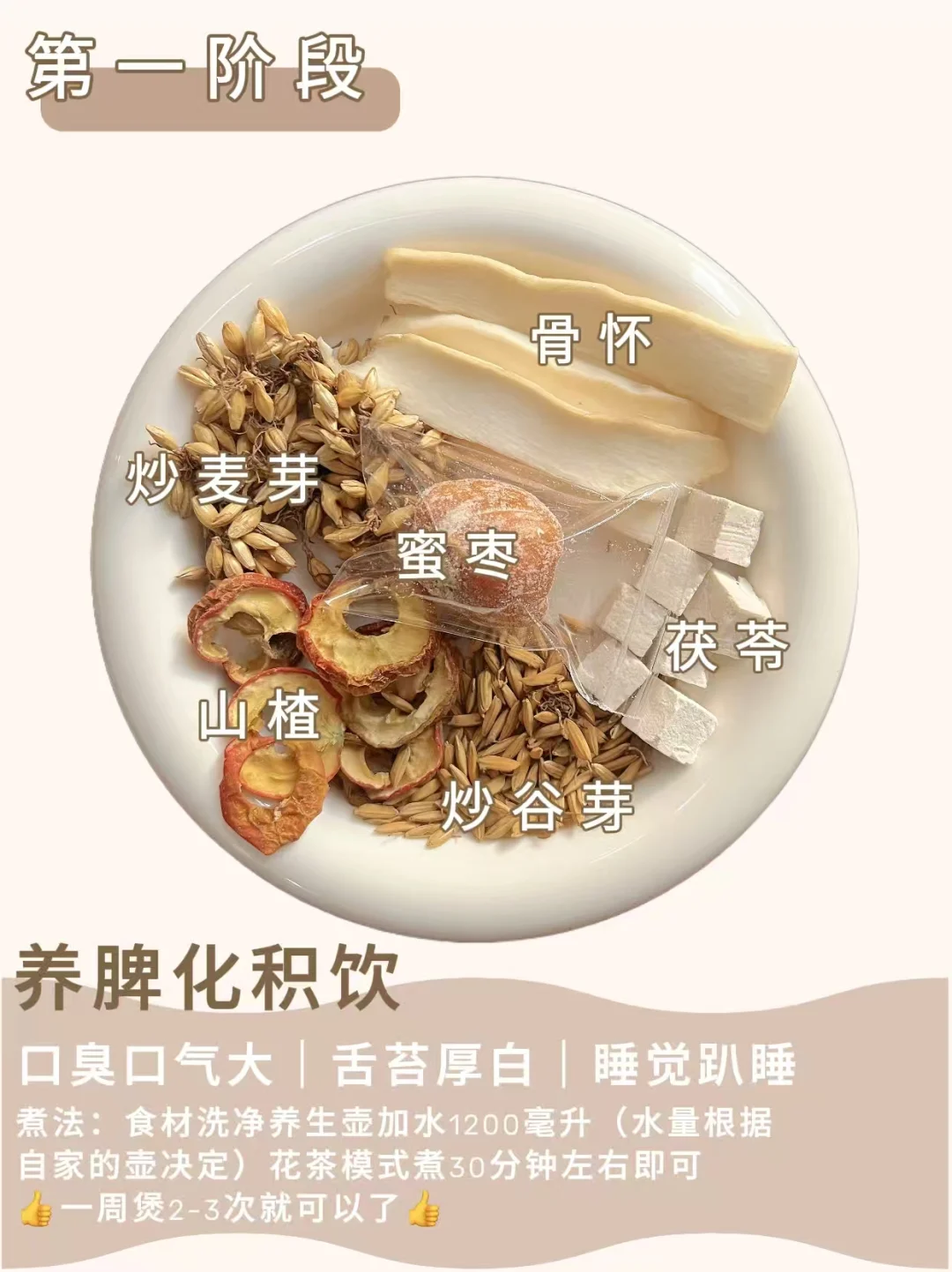 食材:炒麦芽 炒谷芽 山楂 茯苓 骨怀 蜜枣