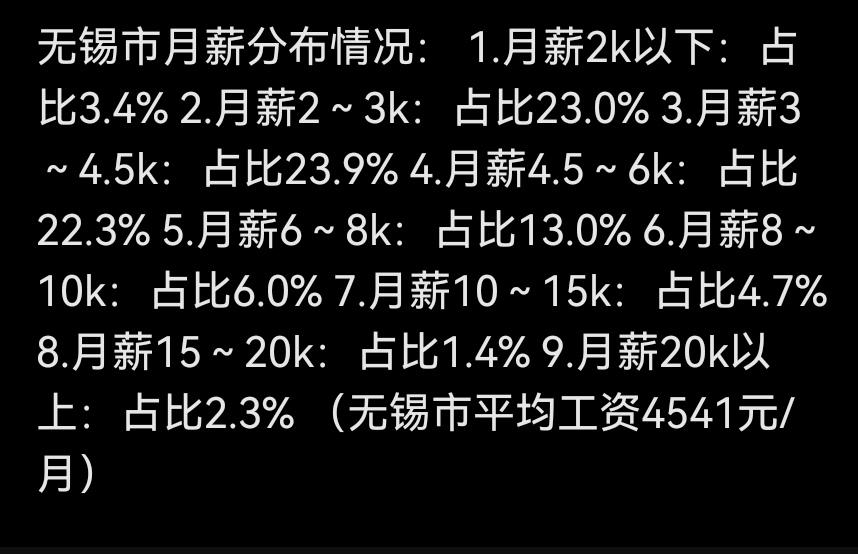 我所在的城市也是江南名城,人均GDP排名全国前三,另外两个一个挖煤一个抽油,都是资源依赖型城市,没有可比性。虽说我们报表上的“人均”超过北京,超过上海,也超过了隔壁那个宇宙第一市,但其实我们自己并不认为是这样,也没多少本地人感到“自豪”,因为…… 看看上班一族的月薪分布吧,比什么都更有说服力。 2000以下: 3.4% 2-3000: 23% 3-4500: 23.9% 4.5-6000: 22.3% 6-8000: 13% 8-10000 : 6% 1-15000: 4.7% 1.5-20000 : 1.4% 超过20000的: 2.3% 盛名其实难副。