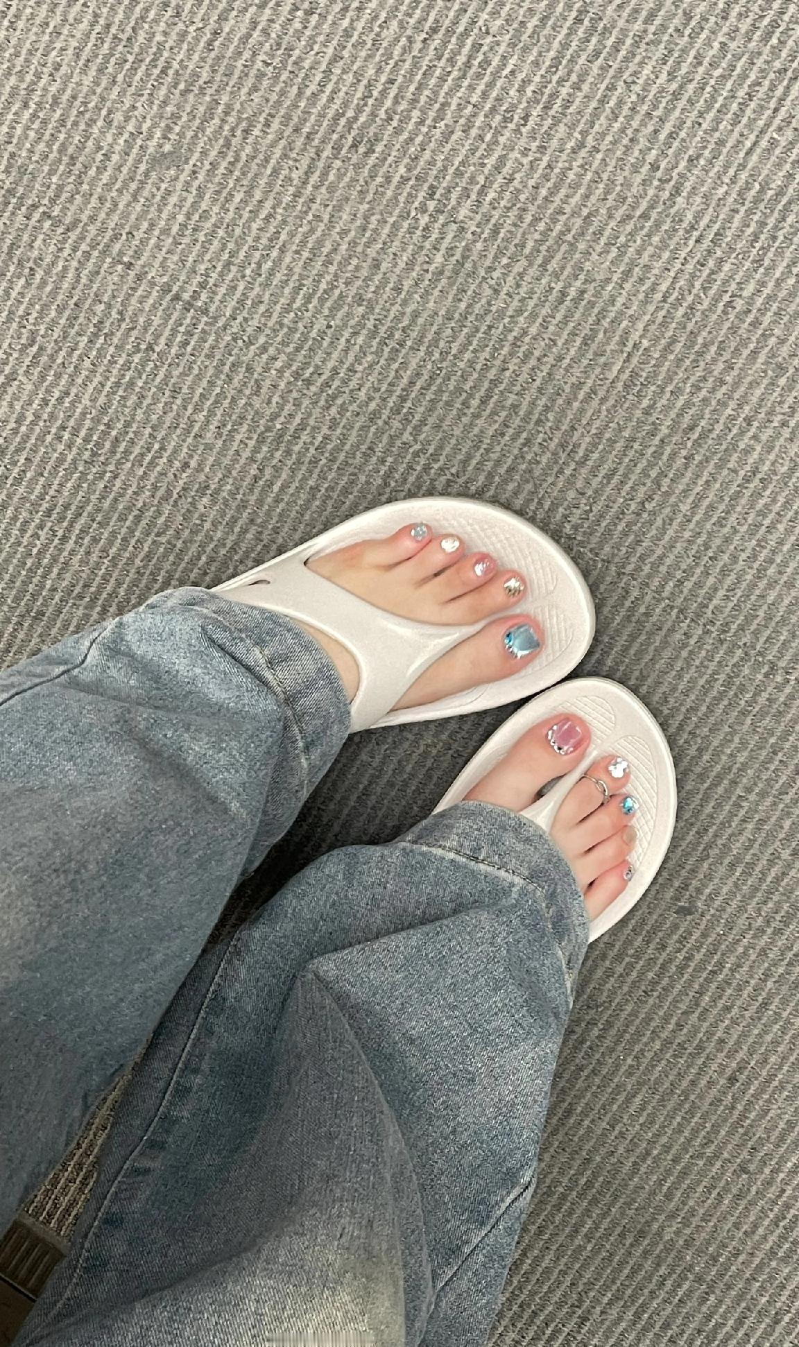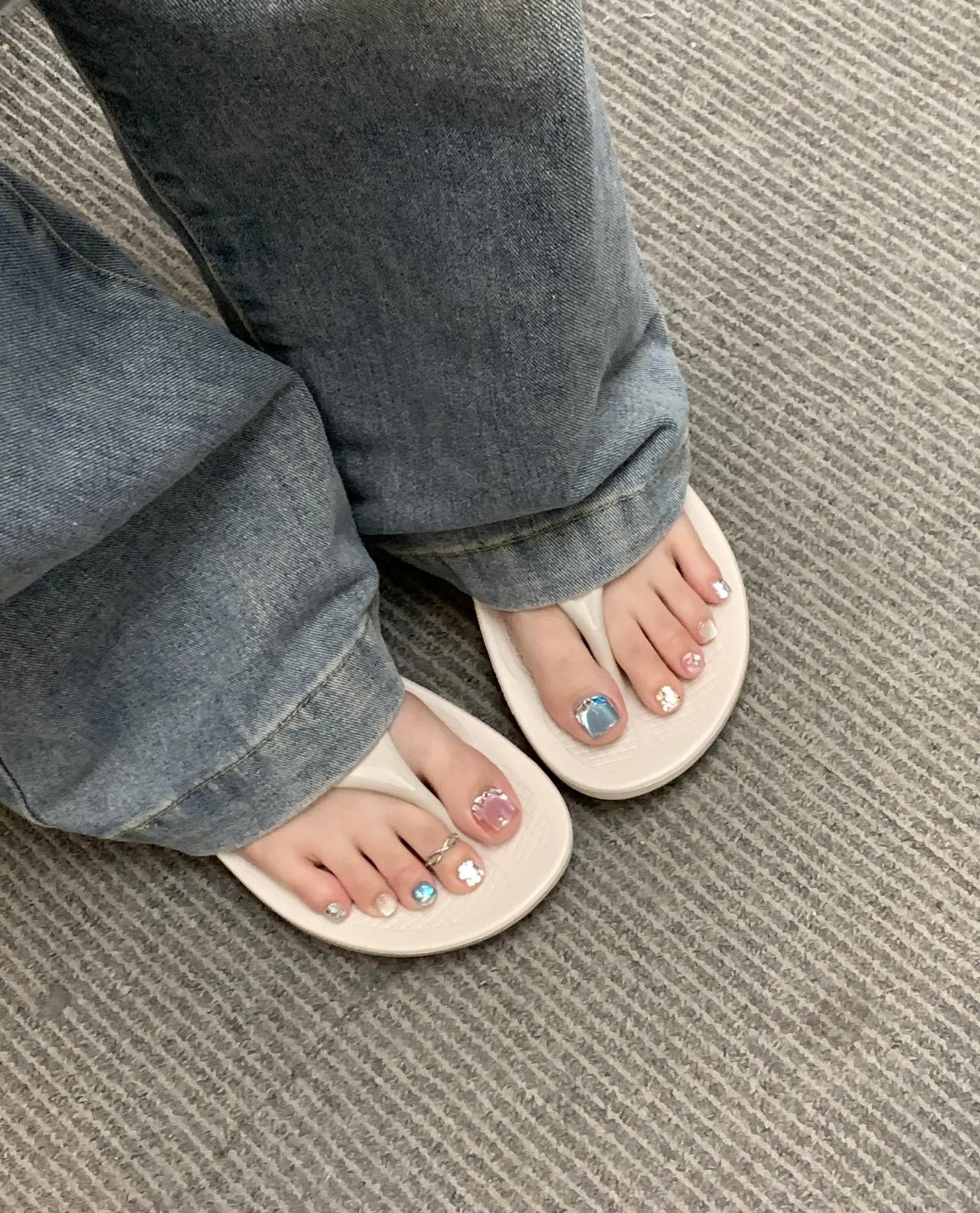 谁能拒绝这双“行走的糖果罐”脚趾甲啊!把雾霾蓝、裸粉、碎钻银这些神仙色号玩出花,每只脚趾都像一颗定制糖块~ 大脚趾的金属蓝美甲自带冷调高级感,边缘的碎钻包边bling到发光;中趾的裸粉渐变温柔又显白,还有金属链条设计增加层次感;小趾的银色碎钻和立体小熊装饰,直接把甜酷值拉满!左右脚错落的色彩搭配,让每一步都像在打翻调色盘,配人字拖或凉鞋都超吸睛~ 这个夏天别让脚趾单调!试试这种糖果系混搭美甲,甜酷感直接焊在脚上,走在路上都忍不住低头欣赏自己的jiojio~