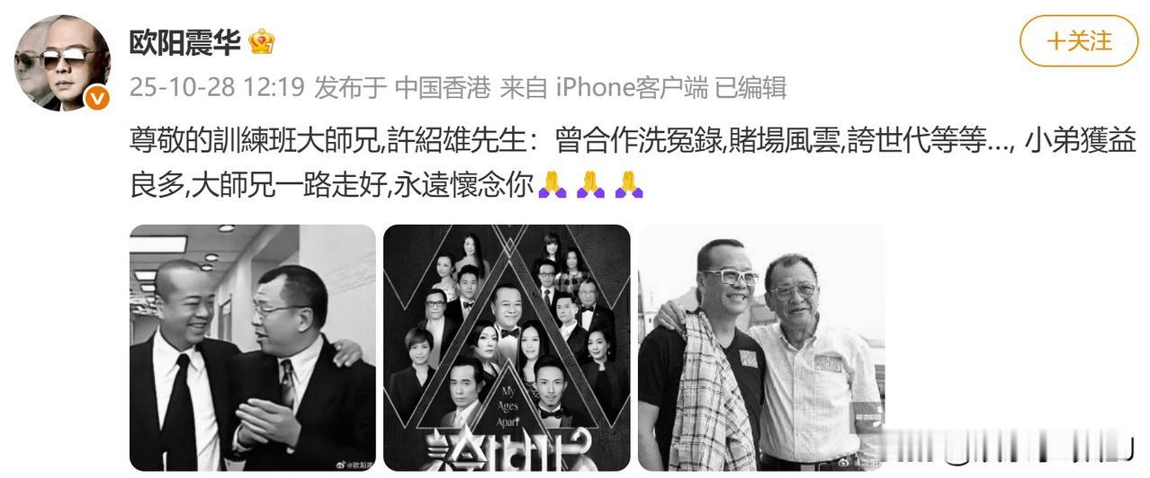 众星悼念许绍雄一个又一个熟悉的面孔离我们而去,我们也老了,不再年轻[流泪] 熟悉的面孔从此再也看不见了,一路成长,一路感觉熟悉的很多再也看不见了。愿欢喜哥一路走好,来世无病痛🕯️🕯️🕯️许绍雄
