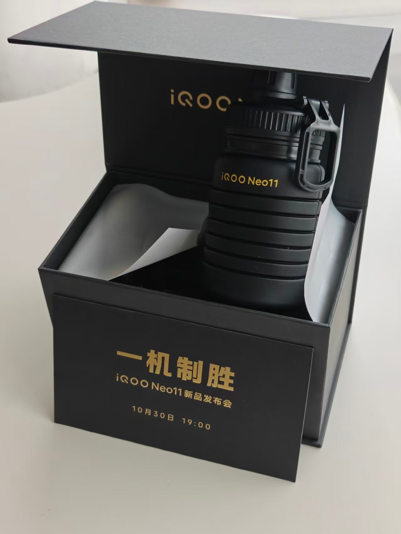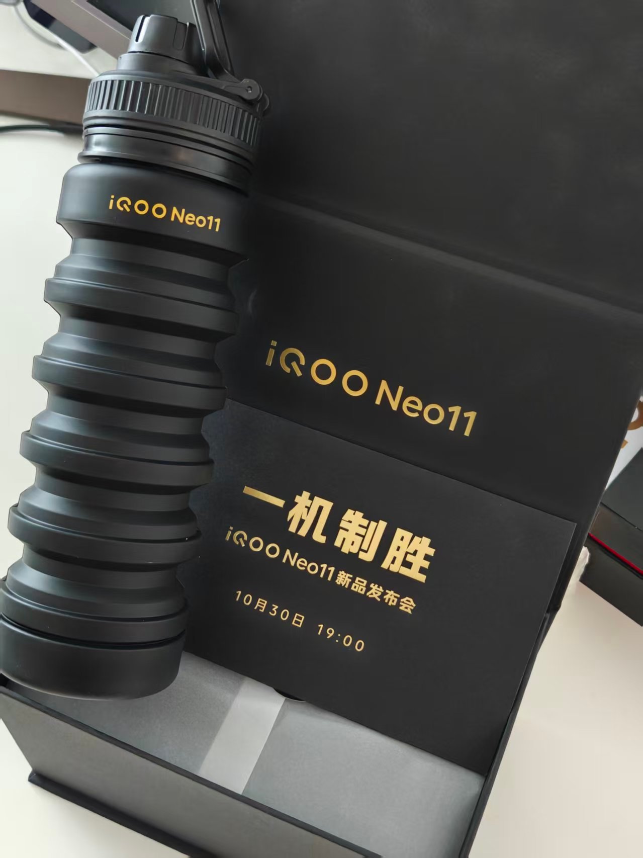 收到了iQOO Neo11的邀请函,里面是一个可拉长的便携户外水壶。10月30号19:00,一起看看iQOO Neo11是不是真的“一杯满足,一机制胜!”