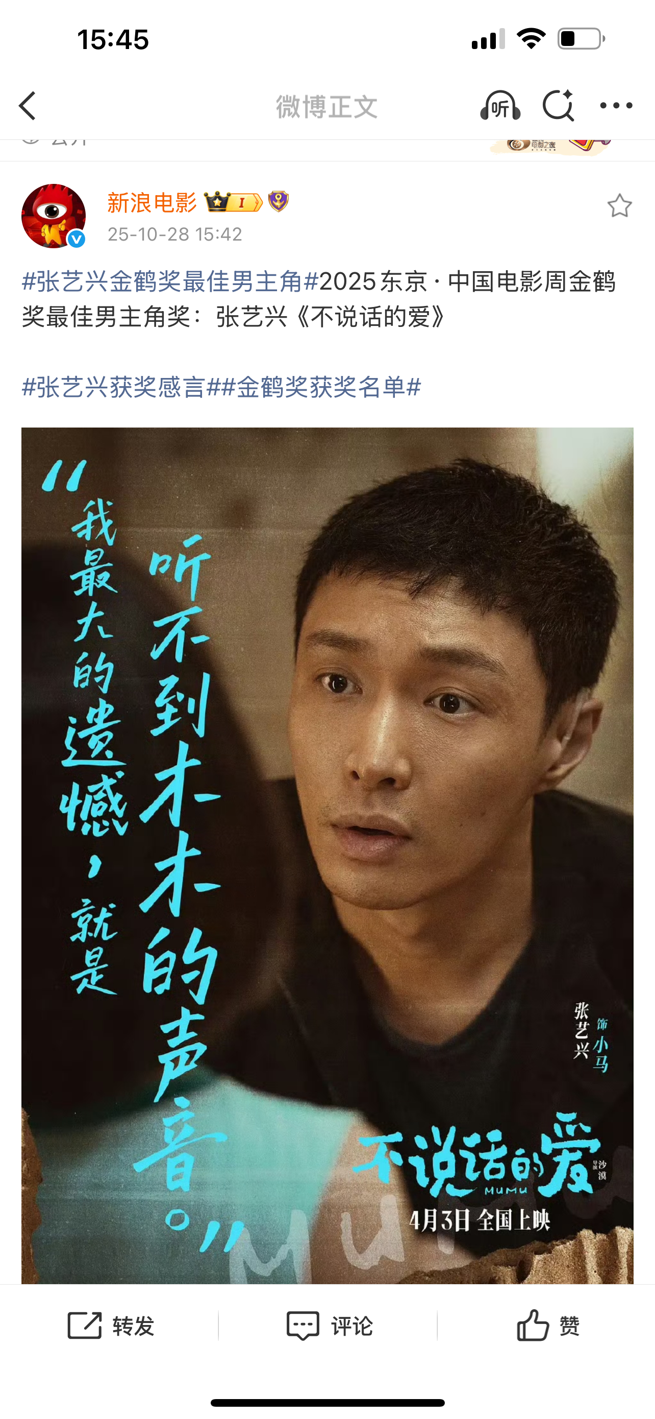 恭喜张艺兴凭借《不说话的爱》斩获金鹤奖最佳男主角🏆实至名归[送花花]我们小马值