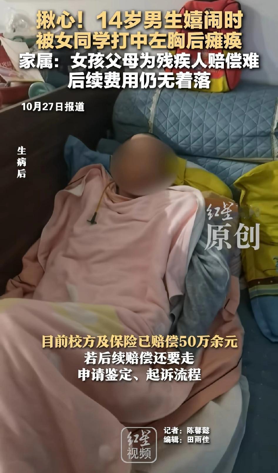 “太揪心了!”14岁男同学嬉闹时,嘲笑女同学为“大力女侠 ”,结果女生举手打向男同学左胸 ,令人没想到的是男同学随后瘫痪 。 男同学在学校和女同学嬉闹时,随口说了一句女生的坏话 ,引起女生的不满,随即举起手来打向男同学的左胸 ,导致男同学瘫痪。 责任判决,学校担责70%,女同学担责20% ,男同学担责10% 。女同学父母均为残疾人 ,后续费用仍无着落 。 此事引起网友热议 ,有网友说 :“知道女孩父母都是残疾,还嘲笑人家,还是同学,做人要有分寸感。” 还有网友说:“女孩子这样的家庭情况,很容易在学校被欺负,那一拳很有可能是男孩子欺负她以后的反击,不然怎么可能只有两成责任。” 也有网友说:“我儿子说班里一半以上都被取了外号,我儿子也被取了,跟我儿子说不要管他们就好。” 上过学的人都知道,在学校里经常会有些同学给其他人起“外号 ”。这种行为真的不应该出现在校园这种。 学校是给孩子提供学习的地方,不是用来“霸凌”的。家长们也要好好的教育自己的孩子,不要随便给别的孩子起外号 。如果有人给孩子起了外号,要及时和校方沟通 。 此事件不是个例,这是学校经常会发生的事情 ,同学之间动手没有轻重 。一定要注意分寸 。 对此你有什么看法 ?