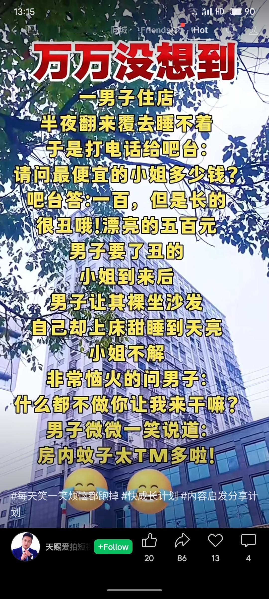 男子住店因蚊子太多,特意叫来一位长相不佳的小姐。他让小姐坐在沙发上,自己则上床安