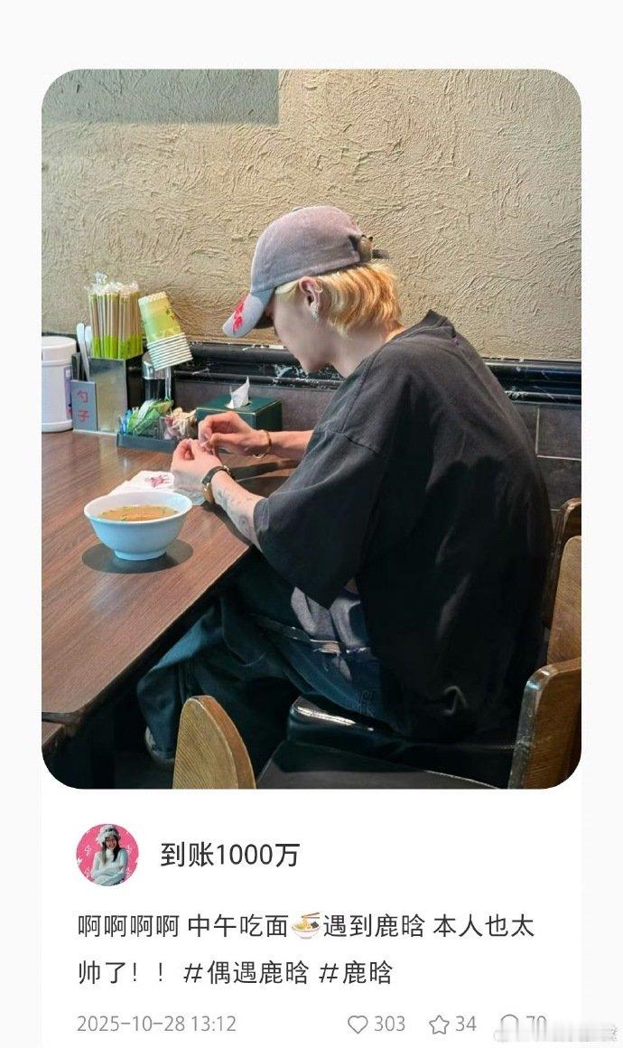 网友吃面偶遇鹿晗 谁懂啊!刷到网友偶遇鹿晗剥蒜吃面,我羡慕到啃手:为啥北京的幸运儿永远比我多,我也想去偶遇!网友偶遇鹿晗在剥蒜