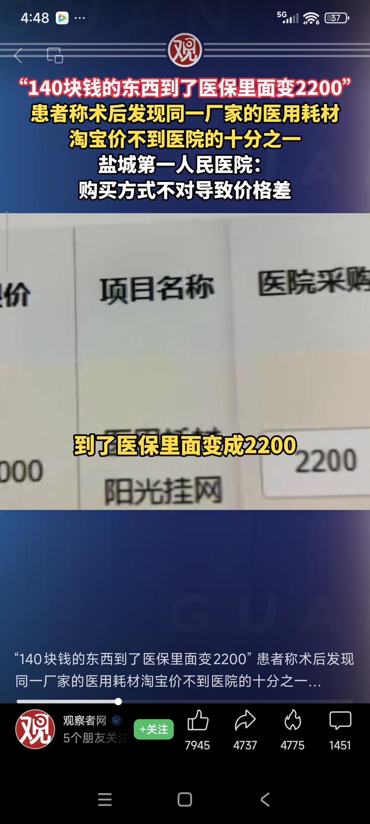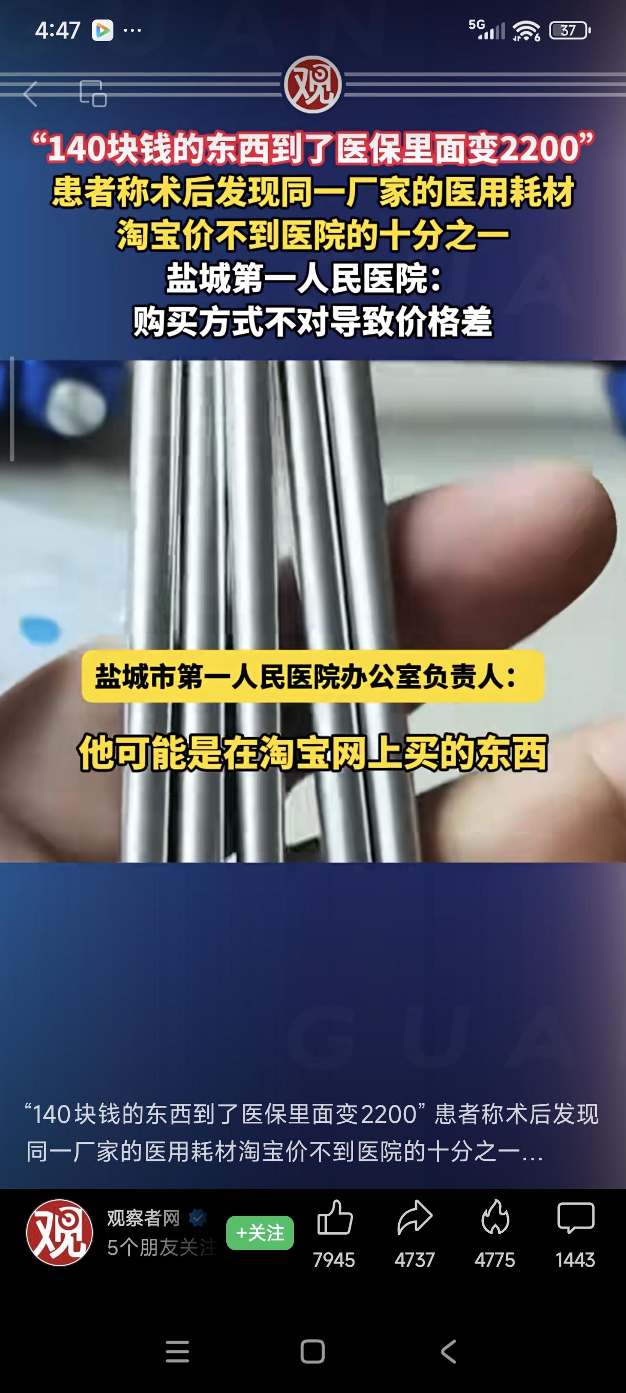 这算是露馅了吧?140块钱的东西到了医保里面就成了2200块钱,工作人员还说,是购买渠道不对。 一名患者,在医院安装了外固定支架,花了1万8590元,后来他发现,同样的东西,同样的厂家,同样的合格证,同样的生产编号,在网上只花1800块钱就能买齐,医院的价格比这个高出了十几倍,还有网上140块钱的东西,在医保里面就变成了2200块钱,他去反映问题的时候,医院又把价格调成了895。 对此,医院的工作人员回复说,患者是在淘宝网上买的,购买途径不对,而且他用的这些医用材料,必须要通过医院购买,这个患者的购买方式就是错的,所以才会有差价,还说医院没有定价权,医保局挂多少钱?医院就收患者多少钱? 什么叫购买方式不对?同一个厂家生产的同样的产品,为什么在网上购买和在医院里购买会差这么多钱?原因出在哪?怪不得大家交的医保一年比一年贵,原来都是这么花出去的呀,真是让人大开眼界。