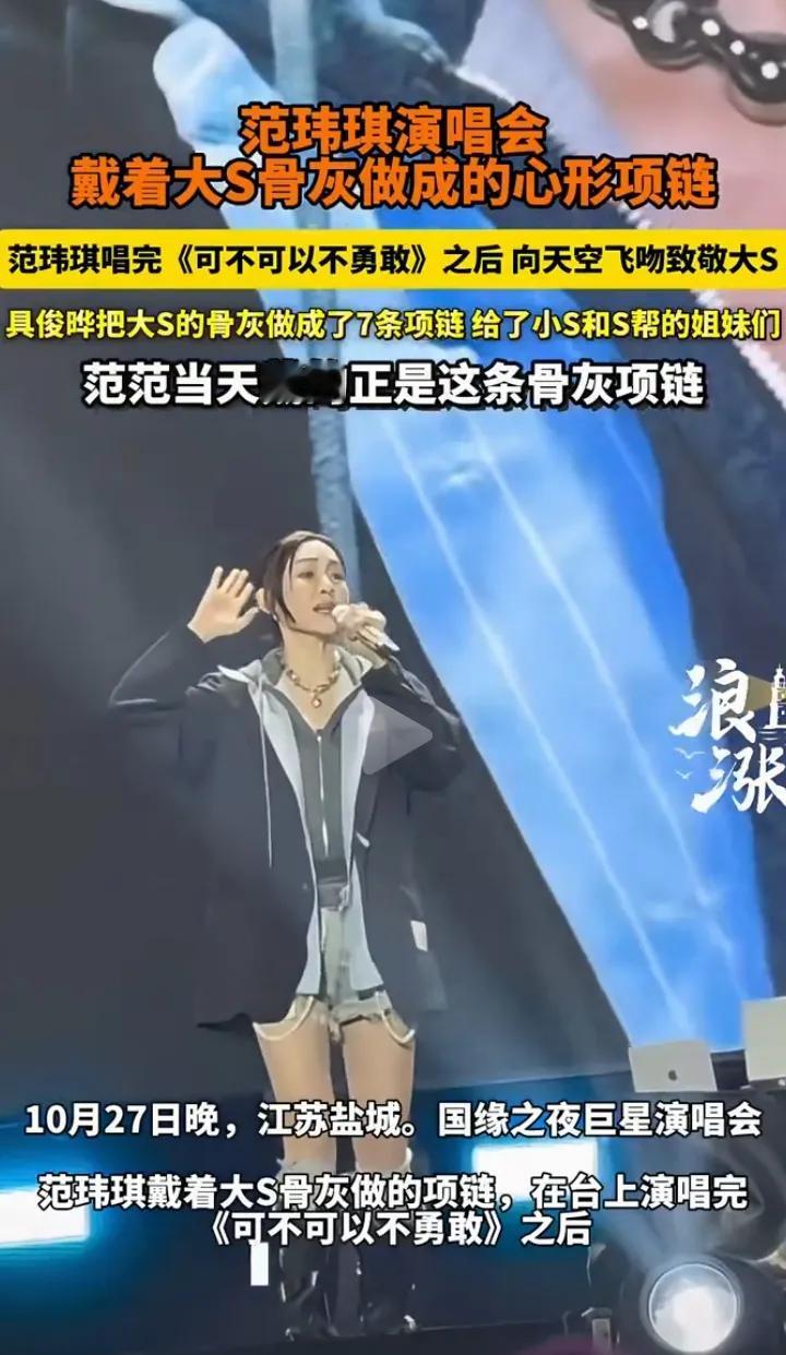 范玮琪戴着大S的骨灰项链 出演唱三个人的歌 一定是有什么含义,也对大S情意的表白 我闺蜜跑来给我说,咱们的情感也像范玮琪和大小S一样的吧?未来我们也有一个姊妹帮吧? 我白了她一眼,告诉她,我们的情感可以天长地久,内心深处装着对方,为对方抛头露面,赴汤蹈火,但是不允许用这样的方式把骨灰带在身上。 总感觉带着装有骨灰的项链,不知道是身体的那个部分呢?内心会害怕!后背发凉! 那家人很奇怪,人走了,孩子不能出席...更没有名字,那个圈子的人人手一个骨灰项链,唯独孩子没有。要💰的时候只找大汪要,不找自己女儿女婿要?