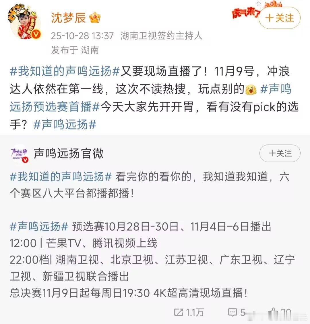 沈梦辰这次不读热搜了声鸣远扬预选赛首播 沈梦辰要主持新音乐综艺《声鸣远扬》了直播,冲浪达人梦辰发文表示这次不读热搜了,要玩点别的,期待播出!声鸣远扬