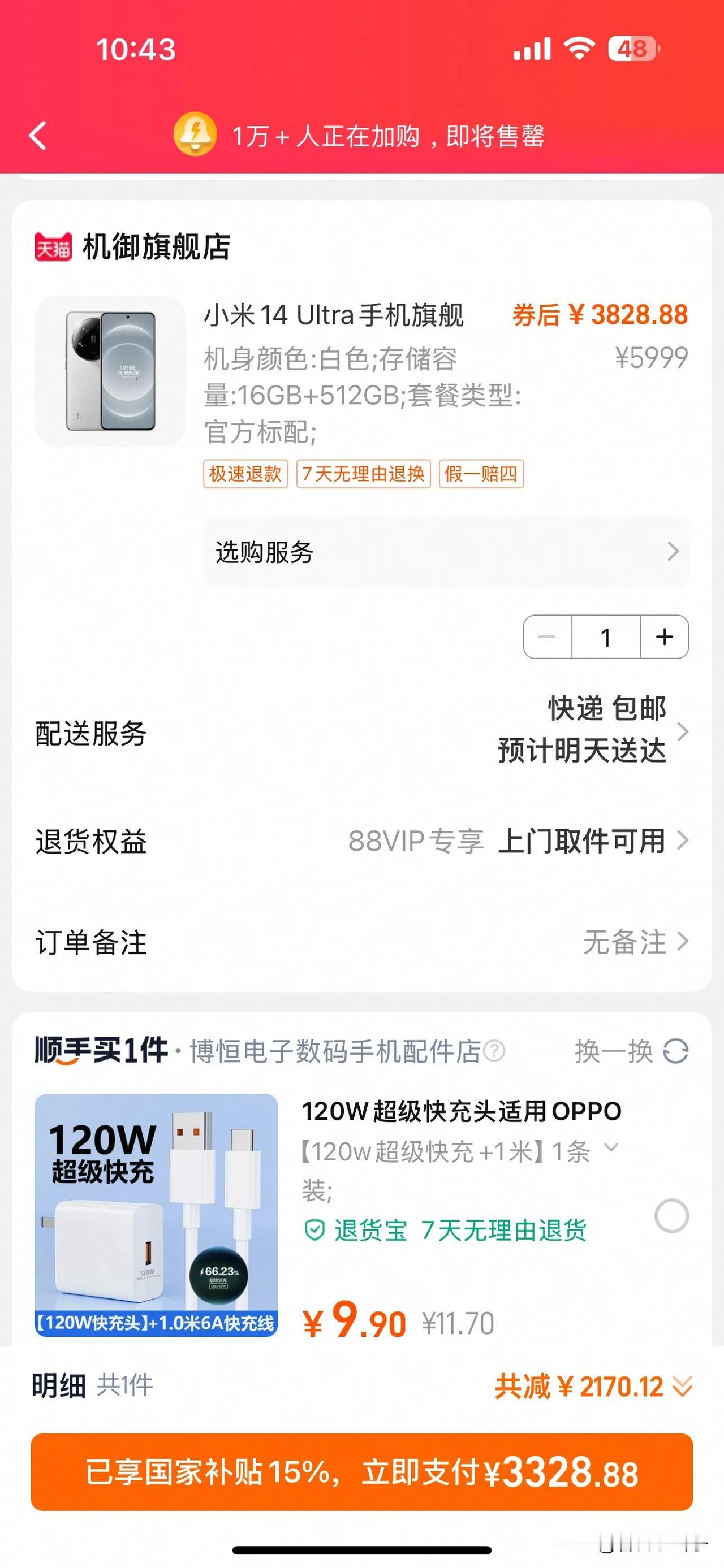 终于下手,小米14ultra,16+512,3328到手,今年的手机价格是真香,再次印证了那句话,没有卖不出去的产品,只有不合适的价格。作为上一代旗舰产品这个价格性价比超高,这价格还要什么自行车!感谢国补