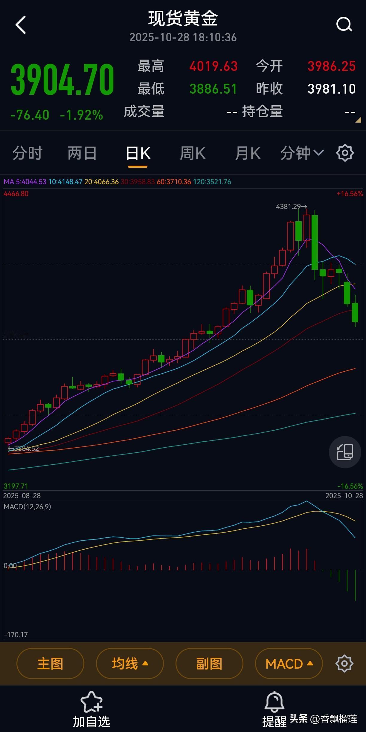 黄金连跌8天,就看今天3904能不能守住,守不住的话就要到3760了。 往上的高点在4040到4076,4000是个关口,过这个关口才有可能反弹趋势形成。这波下跌的动能已经放缓,短暂的回调是必须的过程。 暂时还是别入,也不要补仓,静候佳音! 放宽心,放宽心!