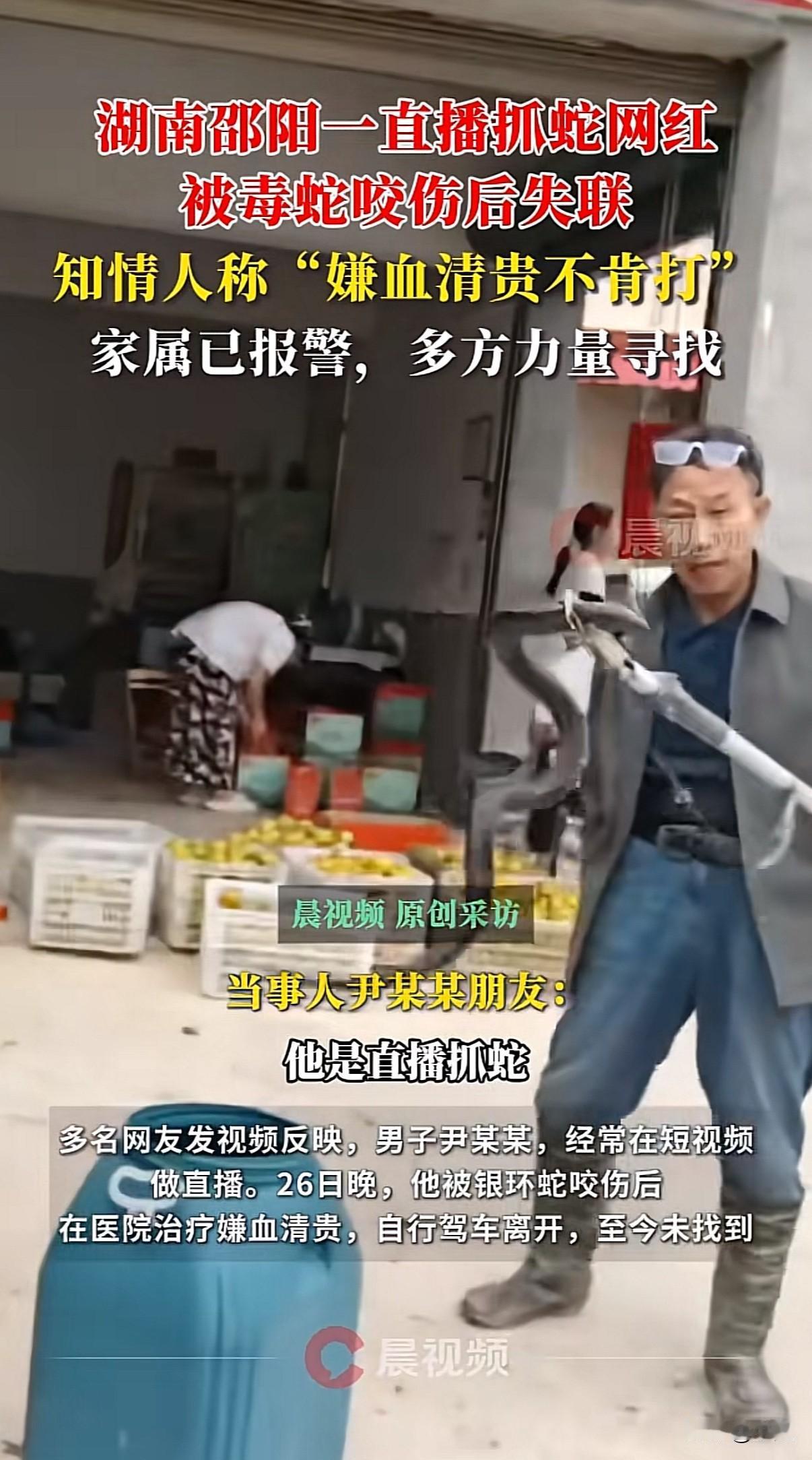 “钱比命重要”!10月26日晚上,湖南洞口县的网红“尹无才”在直播。他当时在挖蛇洞,徒手从洞里抓出一条银环蛇。结果左手食指被咬了。 他立刻做了正确的事——打电话问医院有没有血清。然后去了洞口县人民医院。 医生确诊是银环蛇咬伤,要求他住院注射抗蛇毒血清。但听说费用后,他做了决定:不治了。 检查都做了,血清没打。他直接开着那辆湘E0068U的雪佛兰轿车离开医院。时间是27日凌晨00:08。 之后,手机关机,人车消失。 有个细节很扎心。据说医生告诉他费用可以报销一部分,但他还是觉得太贵。现在过去这么久,生存希望已经很渺茫。 更讽刺的是,19天前他刚发过视频,提醒粉丝“被银环蛇咬必须在2小时内打血清”。他自己很清楚危险,却因为钱放弃了。 银环蛇的毒是神经毒素。咬的时候可能不疼不肿,一两个小时后才开始出现无力、麻木、呼吸困难。它会麻痹呼吸肌肉,让人在清醒状态下无法呼吸,致死率极高。 血清价格在不同医院有差异,但已经纳入医保甲类目录。个人实际需要承担的部分并不算天文数字。可惜这个信息可能没传达到位,或者他依然无法承受。 一个59岁的人,白天帮人搬橘子打工,晚上直播抓蛇。这种生活状态,说明经济条件可能并不宽裕。直播抓蛇或许是他增加收入的途径。 现在警方、救援队和家属还在找。车辆最后出现在山门镇方向,但至今没有踪迹。 这件事暴露了几个现实:医疗知识普及不够,很多人不知道血清可以报销;经济压力让一些人不得不冒险;短视频时代的冒险直播,背后往往是生活的无奈。 希望不要再有下一个尹无才了。