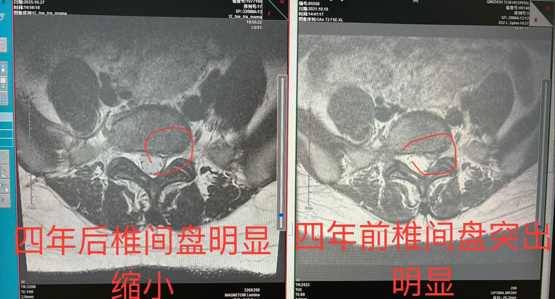 椎间盘脱出了能不能保守治疗?今天碰到一个病例,四年前椎间盘脱出,选择保守治疗,四年后复查,椎间盘脱出已经基本消失。这类病例还是比较少见,每个病人的身体类型都不一样,治疗也不一样。