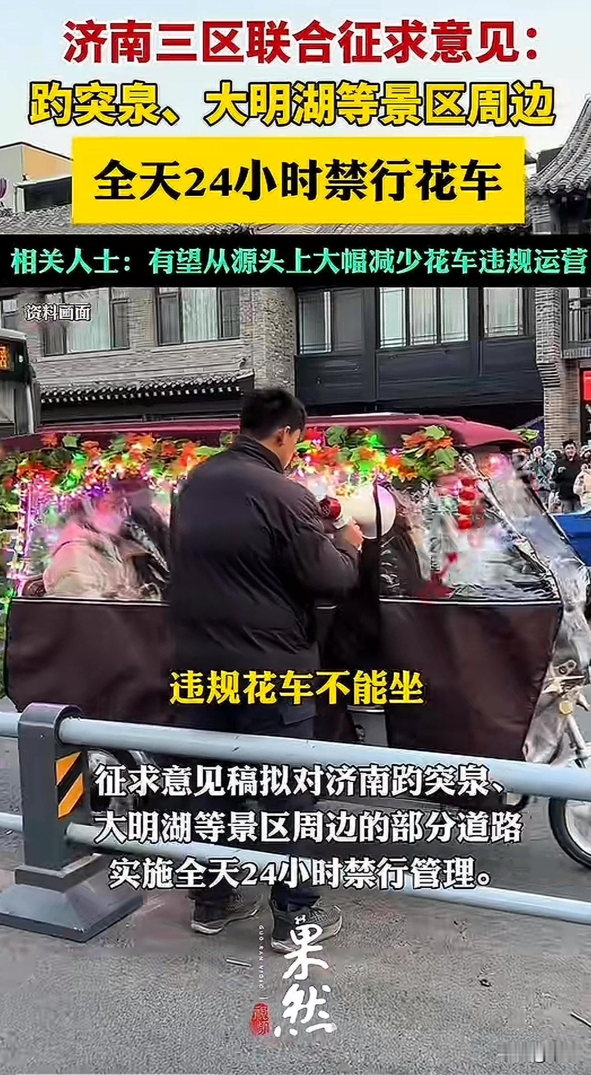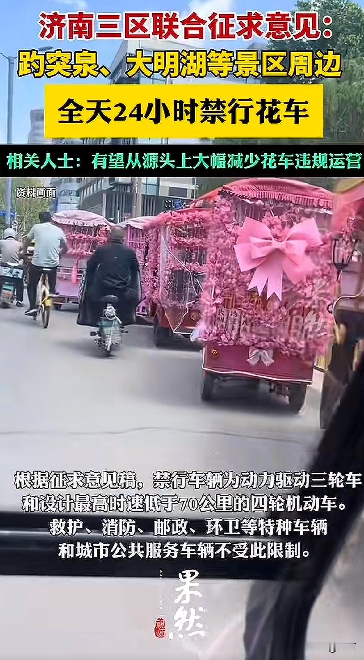 济南历下、市中、天桥三区联合发了征求意见稿,拟对趵突泉、大明湖等景区周边十几条道路,全天禁行动力三轮车和低速四轮车,10月24日到11月22日问大家意见,救护、快递这些特种车不受限。 景区周边这些车问题不少,好多没正规认证,司机乱闯红灯,还随意停着揽客,节假日特堵。花车更是老毛病,之前整治完总回潮,现在粉色花车还搞价格联盟,三公里能要40块,坑游客也坏城市形象。 这次禁行算是抓准了关键,比之前临时整治靠谱,能从源头减少违规空间。不过也得考虑,游客累的时候确实需要方便的代步工具,后续要是能补上路网或者短途接驳就更完善了,毕竟治堵和便民得兼顾着来。