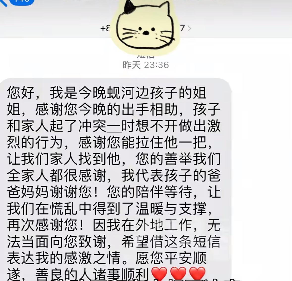 女孩散步偶遇男孩在河边欲跳河,一把将其拉下,一直陪伴了半个小时,直到看到他被家长接走。10月27日,山东烟台。女孩称,自己晚上在河边溜达,看到一个男孩在哭,以为是心情不好哭一下就走了。因为离河边特别近,自己不放心就停留了一下,看完对方哭完坐那点了一根烟,吸完就开始脱衣服。自己过去他就准备往下跳,把他拉下来后,问他什么也不说。她称当时自己手都是抖的,后来对方妈妈打电话过来,又陪伴了他半个小时。最后男孩被家长接走了,她表示当时特别害怕。女孩对男孩说你这跳下去了你爸妈怎么办?我亏得我回来了,我要是没回来,你跳下去了我这一辈子我不懊悔吗? 事后,男孩家人发来感谢短信,称孩子和家人起了冲突!一时想不开做出激烈的行为,感谢您能拉住他一把,让我们家人能找到他,您的善举我们全家人都很感谢!因为我在外地工作无法当面向您致谢!希望借这条短信表达我的感激之情。愿您平安顺遂,善良的人诸事顺利! 再次呼吁家长朋友们学习固然重要,成绩在孩子身心健康面前真的不重要,不要给孩子那么大的压力。不然孩子也不会有这种想法,善良的美女,拯救了一个年轻的生命!救人一命胜造七级浮屠,你是大善大爱!祝好人一生平安幸福! 下方图一是美女本人,她今天发视频了人美心善!!!