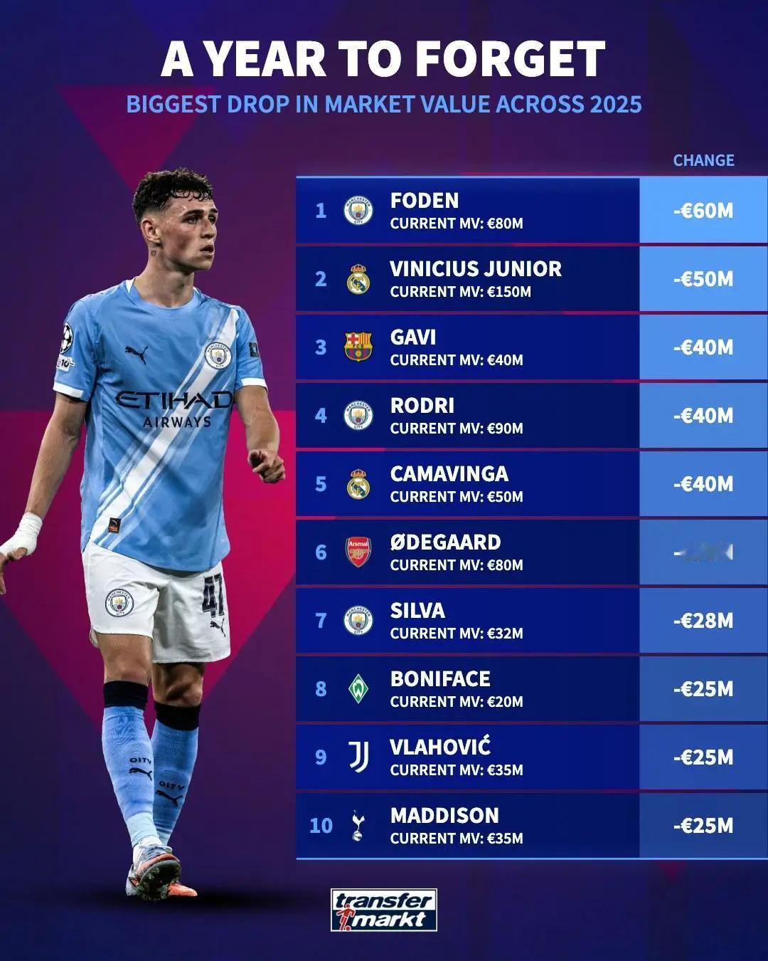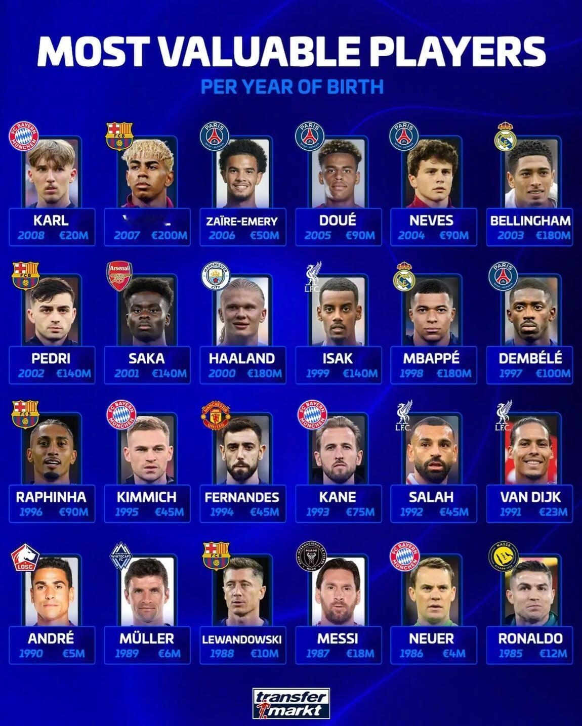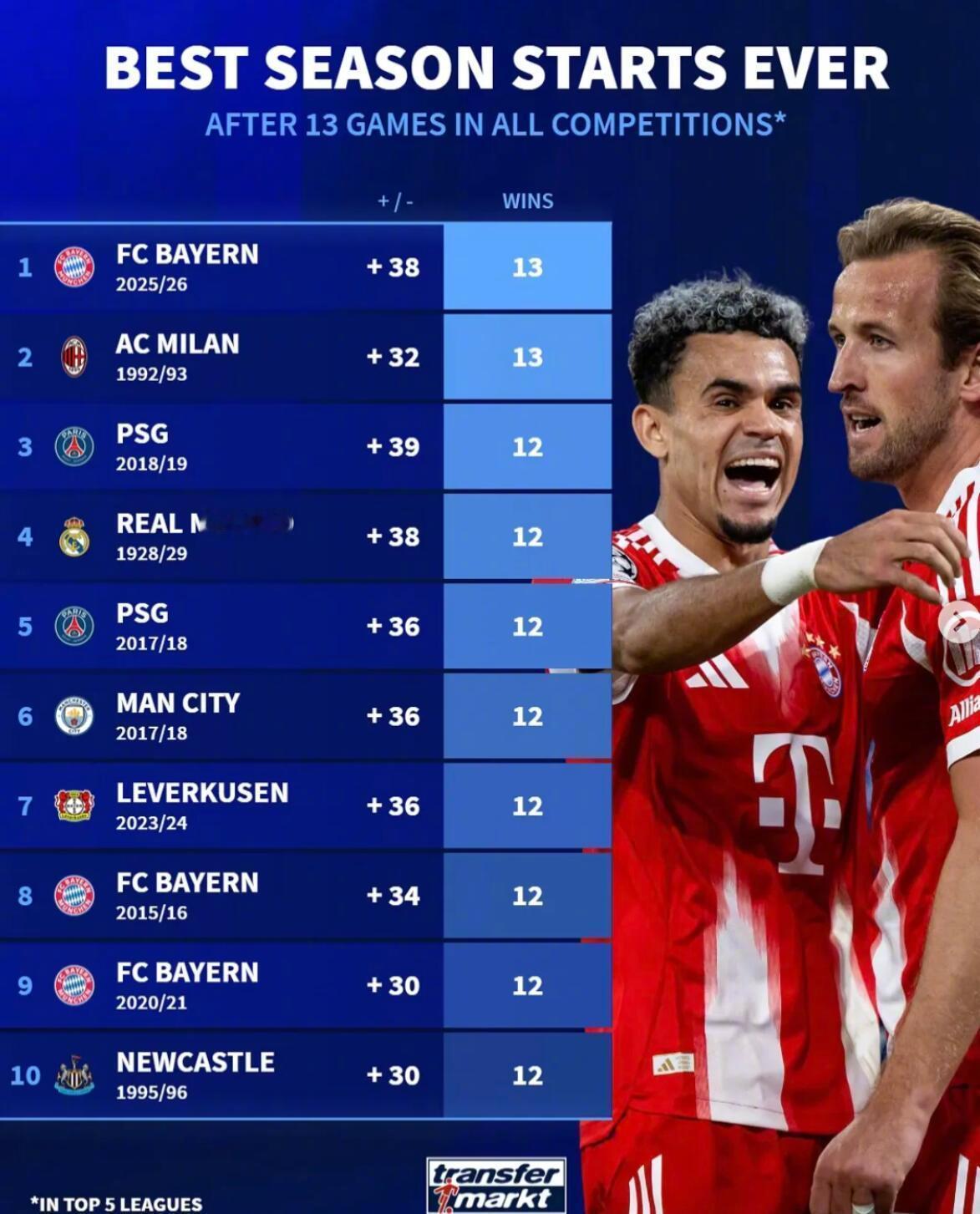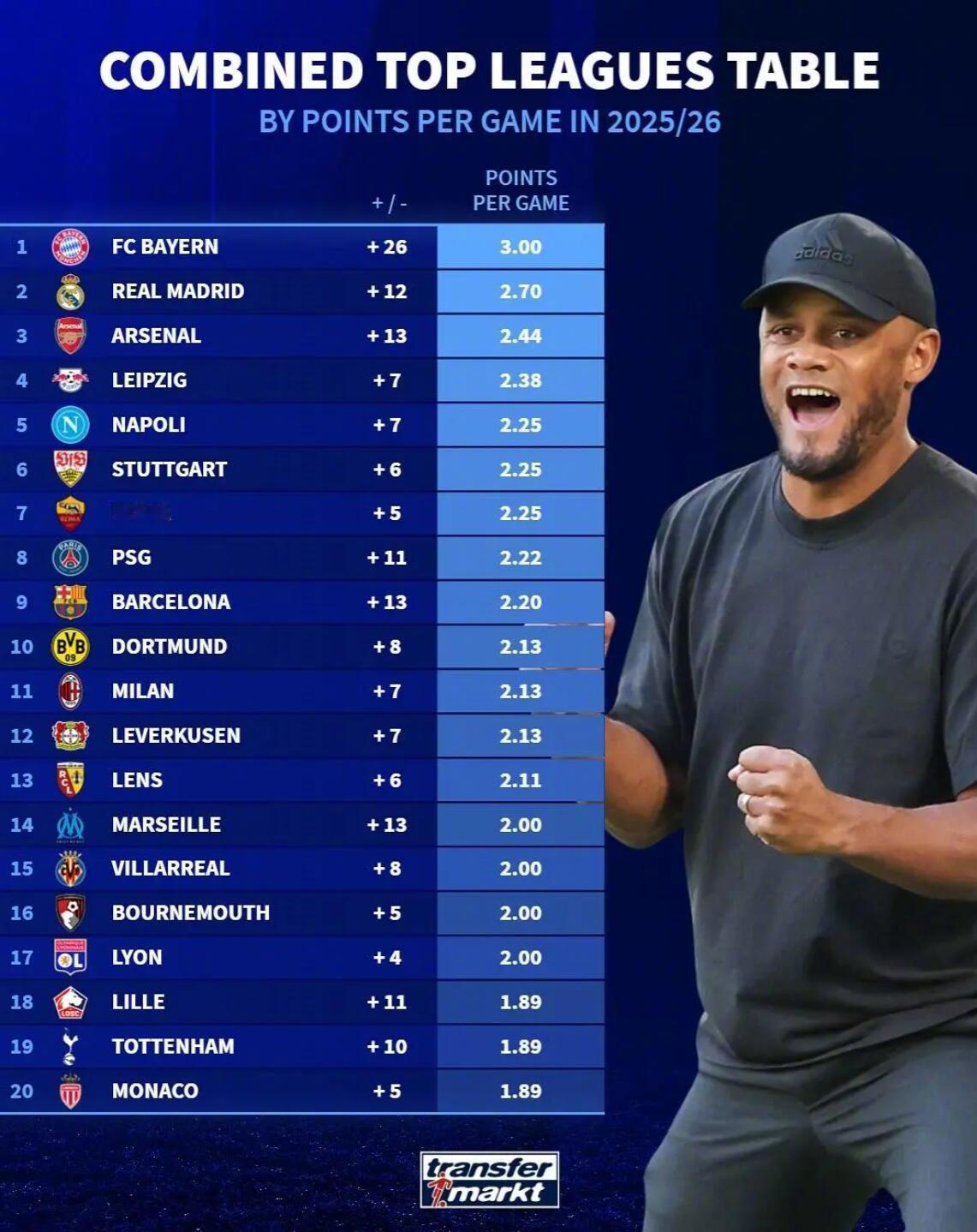足坛短讯! ★霸主归位! 拜仁以净胜球优势超越米兰,13连胜收获五大联赛历史最佳开局。 同时拜仁也创下德甲联赛最佳开局,8轮全胜净胜球达到26个,并且将客场连续进球至少3个的德甲纪录刷新到了8场。 ★五大联赛目前场均积分最多的20支球队! 拜仁当仁不让排名第一。 ★姆巴佩最喜欢的对手! 巴萨是姆巴佩第四喜欢的对手。 ★姆巴佩成为本世纪第三位连续4场西班牙国家德比破门的球员。 ★西班牙国家德比的风波还在持续发酵,不过这才应该是国家德比本来应该有的样子,充满争议,火气十足,之前两个赛季实在太和平了! ★福登是2025年身价跌幅最多的球员,已经一路跌了6000万欧元。 ★当今足坛每个年龄身价最高的球星! ★本赛季欧冠最年长出场球员榜!