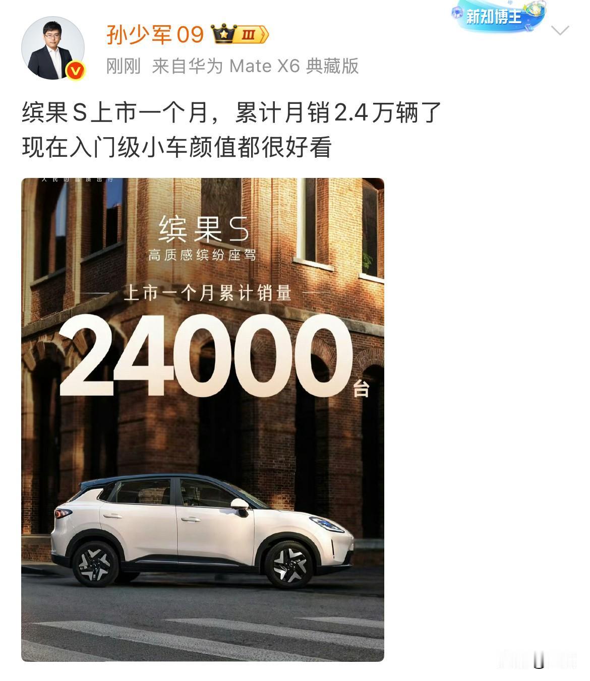 孙少军: 缤果S上市一个月,累计月销2.4万辆! 没想到五菱搞了一个小爆款出来,这款看起来六万多块钱出头的SUV,在一个月时间里面搞出了这么大一个动静! 因为大家都知道,这个的直接对手就是星愿,他们两个价格差不多不,大小差不多,造型差不多,所以他们两个的客户群体完全就是重合的! 在这个时候,就是拼的谁的空间更大,谁的续航能力更强,甚至谁长得更好看,因为这两个车的好多用户都是女性,他们更看重这个车的稳定性和颜值。 当然星愿也挺不错,可能这个市场被这两个品牌炒热了之后,估计还会有更多的牌子加进来,我们看看谁能够继续在这个价格里面做出不一样的东西。 毕竟这个市场的利润本身就不大,必须把量做起来才算是成了。