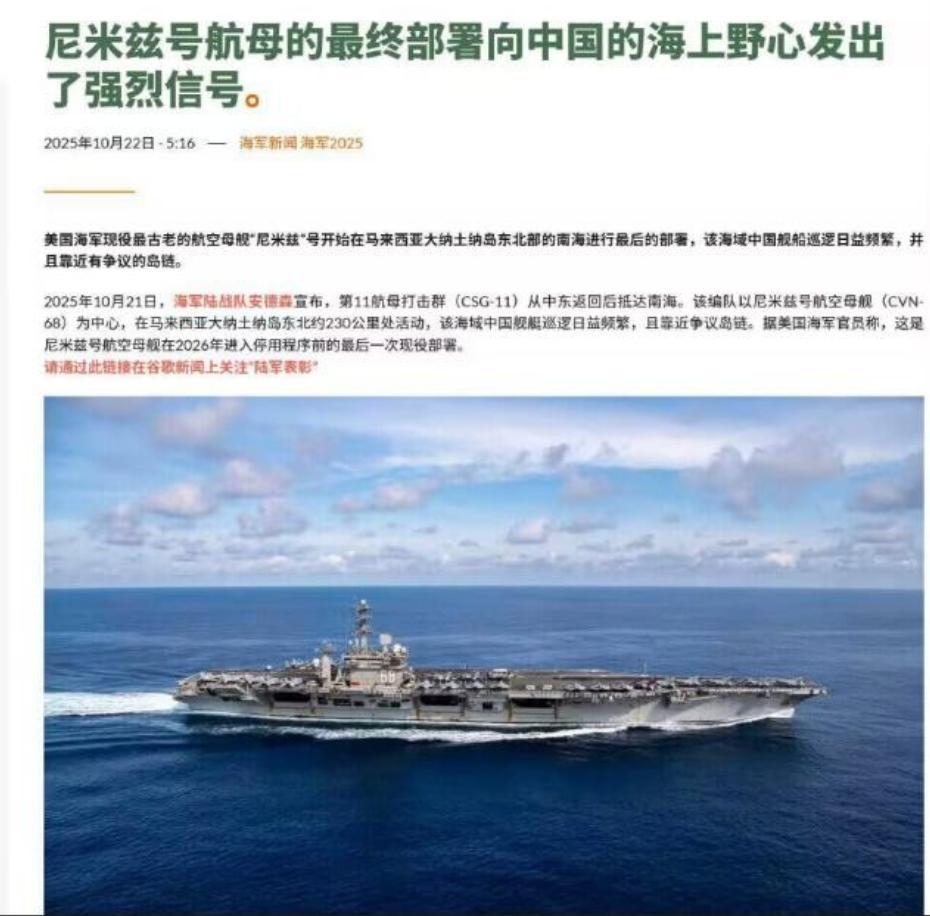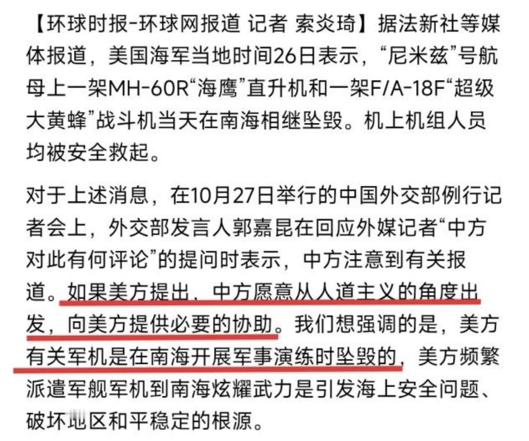 中方回应美军南海坠机,愿提供人道主义协助 10月26号,美军的“尼米兹”号航母在南海搞军事演练,不到半小时里接连摔了两架飞机,一架是直升机,另一架是战斗机,好在机组人员都救上来了,没出人命。 第二天咱们外交部就回应了,态度特别明确:首先说了注意到这事儿了,要是美方开口求帮忙,咱们愿意从人道主义角度给必要的协助。 但紧跟着就点透了关键——这飞机不是在别的地方摔的,是美军跑到南海来炫耀武力、搞军事演练时摔的,说到底,美军天天派军舰军机往南海窜,才是这儿不安全、不稳定的根儿。 这话里的意思太清楚了,咱们做人的底线在这儿,不管对方平时怎么折腾,真到了需要帮一把的时候,人道主义的情分不会少,这是大国该有的样子,不趁人之危,也不落井下石。 但咱也绝不是糊涂人,不会因为给帮忙就忘了这事儿的本质是啥。 美军这可不是第一次在南海出幺蛾子了,2022年就有架F-35战机在这儿坠海,当时花了好几个月才捞上来,花了几百万美元。这次更离谱,半小时连摔两架,这哪儿是偶然啊? 你看特朗普后来咋说的,扯什么可能是燃油质量有问题,压根不敢提美军自己的毛病。明眼人都能看出来,美军这些年在南海高强度搞演练,航母军舰连轴转,装备老化没人好好修,人员也疲得不行,不出事才怪。 说白了就是“常在河边走,哪能不湿鞋”,自己非要跑到别人家门口舞刀弄枪,出了岔子能怪谁? 而且咱们提的“给协助”,其实也是把话说透了。 南海这片海咱们比谁都熟,家里的“蛟龙”深潜器能下万米深海,专业的救援船随时待命,真要帮忙打捞,比美军自己租外国的船快多了。 但美军敢开口吗?估计够呛,那些坠海的飞机都是现役主力,上面全是机密技术,让咱们靠近帮忙,他们怕泄密;可要是不找咱们,自己捞又费劲,还得让周边国家看笑话——你不是天天说自己厉害吗?怎么在南海摔了飞机都没人帮、自己还搞不定? 这其实就是美军现在的尴尬处境,一边天天喊着“自由航行”,跑到南海来给盟友撑场面、秀肌肉,一边自己的装备和人员早就跟不上了,威慑力早就打了折扣。 这次特朗普正好在亚洲访问,本来想靠航母给自己撑场面,结果飞机直接摔了,面子里子全没了。周边那些东南亚国家也不傻,看美军这模样,以后还能真信他们能护住自己? 咱们这回应,表面是给协助的善意,其实是把道理摆到了台面上:南海的安稳,得靠咱们沿岸国家自己合作维护,不是靠域外国家跑来耀武扬威。 美军要是真想让这儿安全,就别总派飞机军舰来挑衅,安安稳稳待在自己家门口不好吗?非要跑过来刷存在感,最后只能是自讨没趣。 说真的,咱们的立场从来没变过,人道主义的忙可以帮,但谁要是想借着帮忙掩盖自己搞事的本质,门儿都没有。 美军要是不收敛,还天天往南海窜,以后指不定还得出更丢人的事儿。 毕竟现在早就不是他们说啥就是啥的年代了,跑到别人家门口撒野,迟早得栽跟头。 咱们该帮的忙不含糊,但该说的理也得说透,这就是咱们的态度,不软也不硬,句句在理,也句句实在。 参考资料: 中华网《中方回应美军两架战机坠入南海 愿提供人道协助》