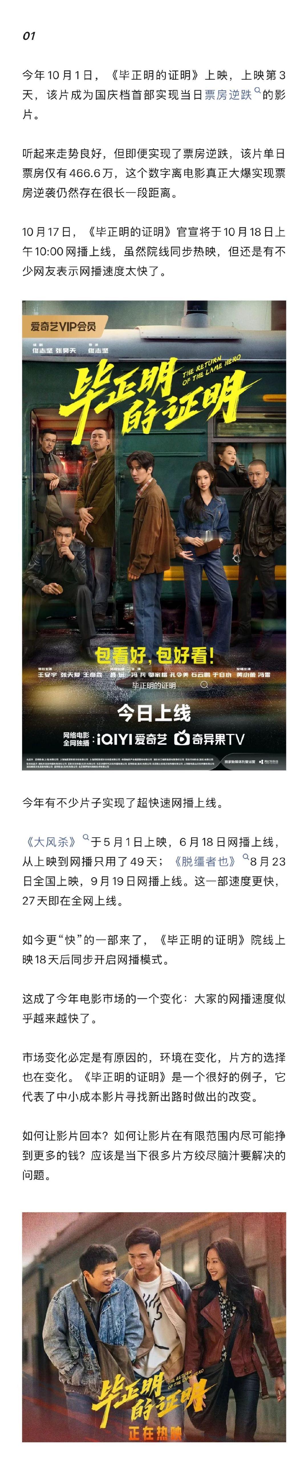 超快网播上线能救中小成本电影吗 毕正明的证明 网播分账票房成绩 《毕正明的证明》网播9天分账破千万,叠加院线8200万票房,成今年中小成本“自救范本”。早些时候《大风杀》网播斩获近3300万分账票房,成为第一个吃螃蟹的影片...↓
