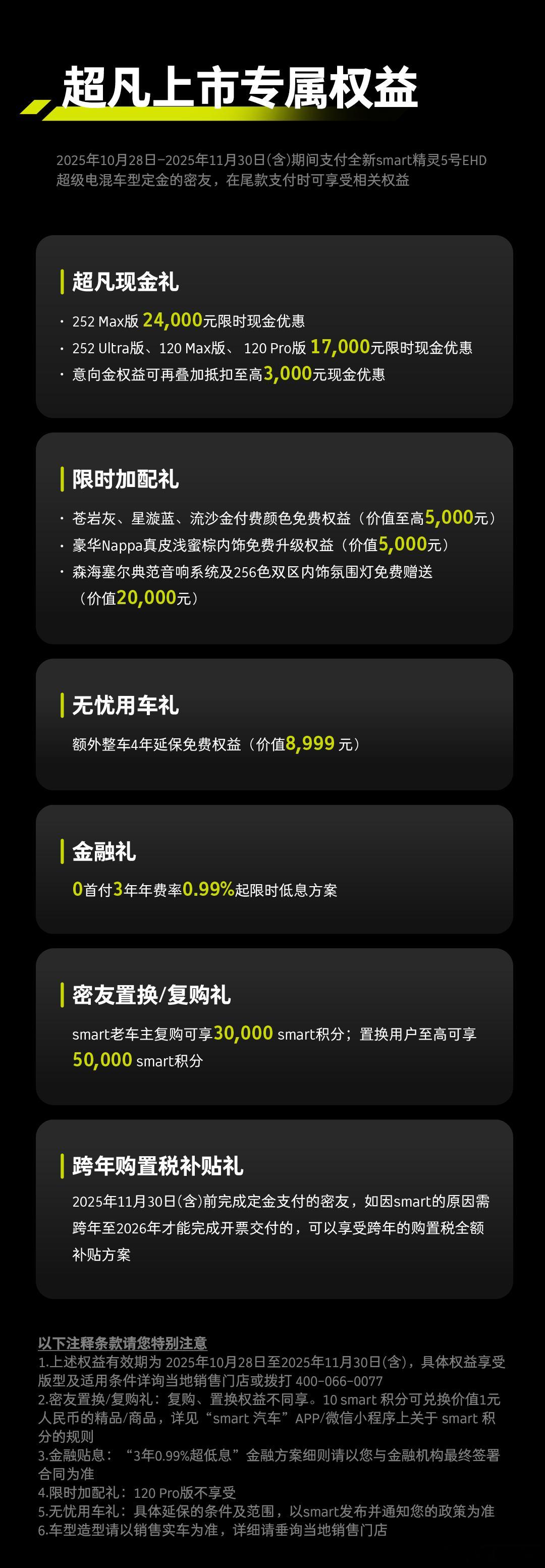 smart 精灵 5 号 EDH 超混版价格也来了,叠加限时现金优惠和预定金抵扣,限时优惠价为 16.99-21.99 万元。