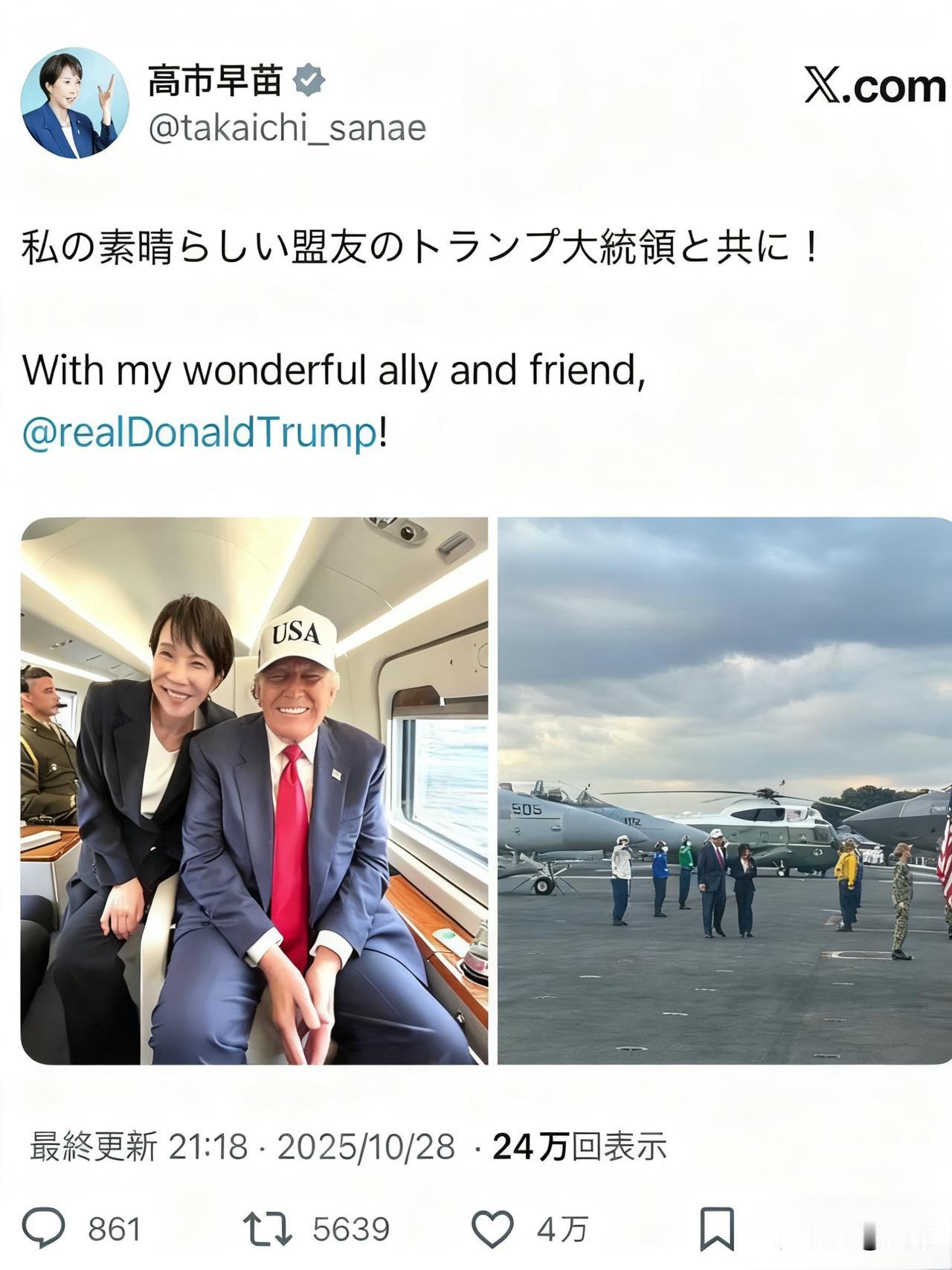 高市早苗发布推文:和我出色的盟友兼朋友(特朗普总统)在一起!