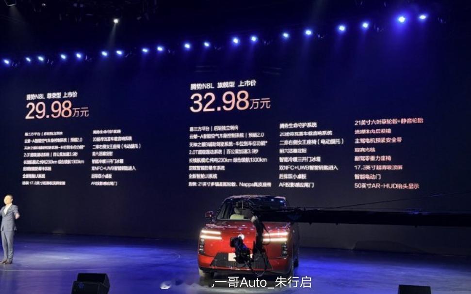 全新腾势N8L今日正式上市,29.98万元起售,新车搭载2.0T的插混动力+“易三方”技术,并且还配备了天神之眼B-辅助驾驶激光版、云辇-A智能车身控制系统。