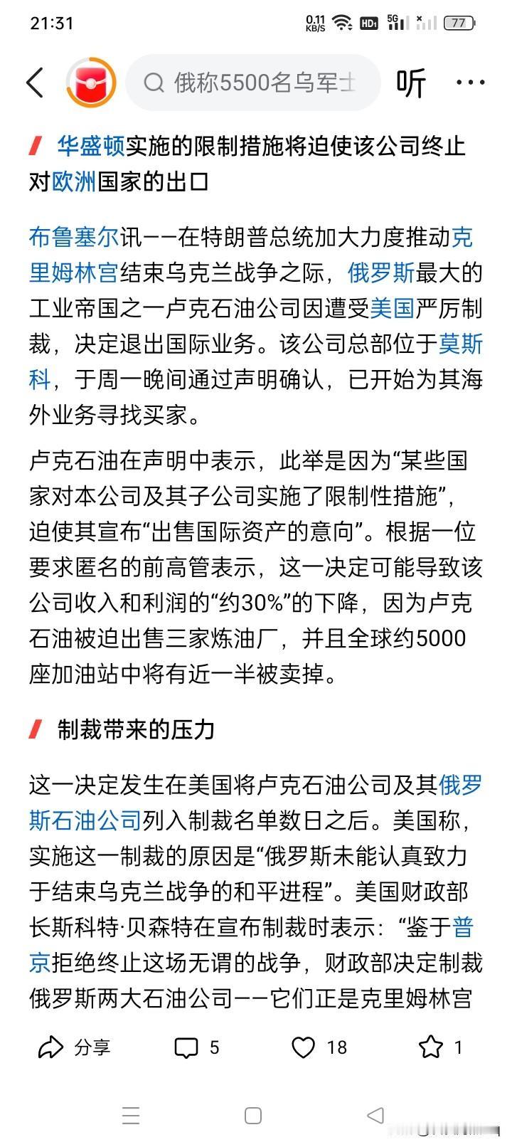 大概很少人想到吧? 美国对俄罗斯最大的两石油公司的制裁,会造成私人的卢克石油公司立即就表示出售国际的资产吧! 如果去想象,估计卢克石油公司在国际上的资产,可能是必须通过美元、或者只有美国的结算系统进行才有可能结算,如果不是,大概他们也不用这么紧张。 即便是用欧元结算,估计麻烦就更大了更,因为欧盟的制裁可能国更严厉,有过之而无不及。