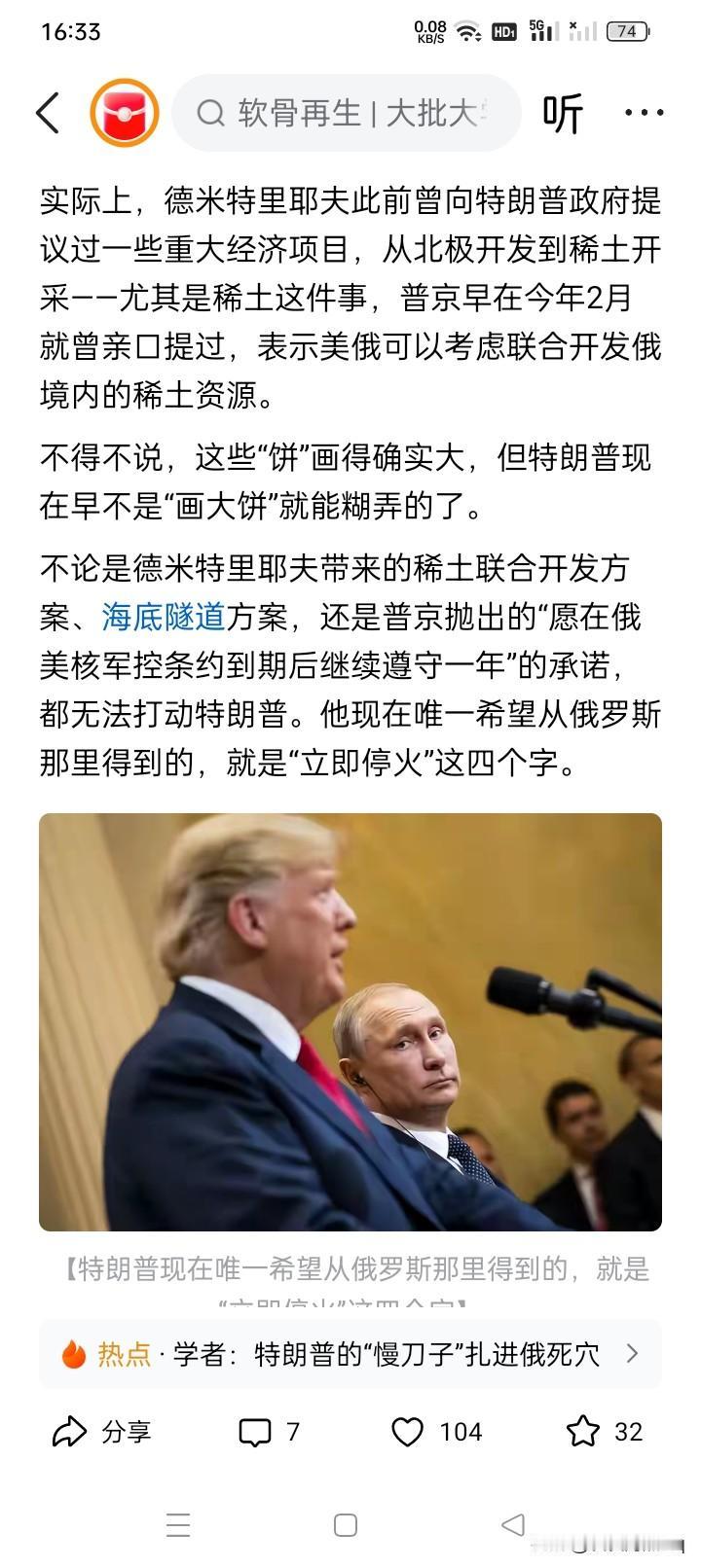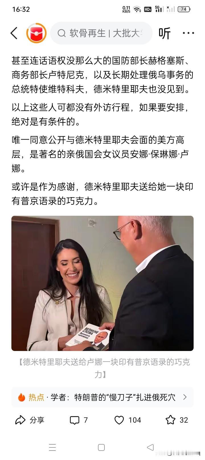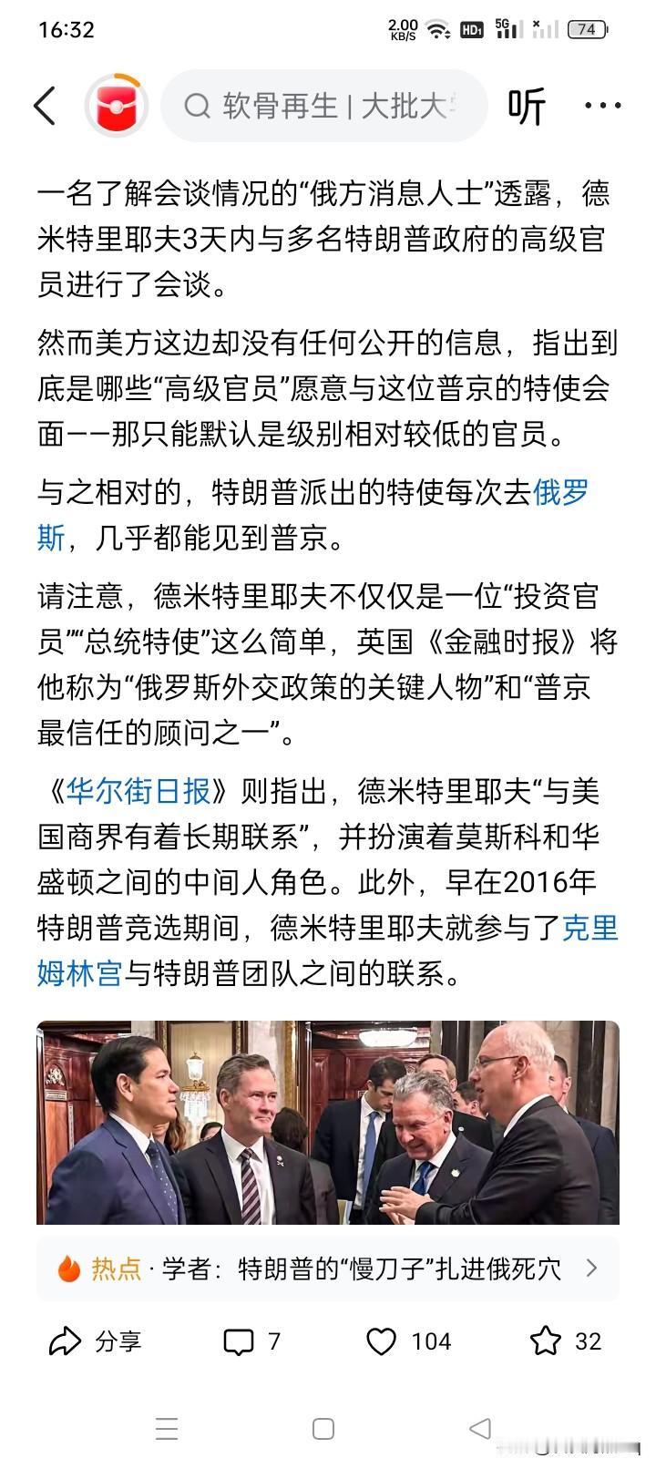 不仅一事无成,似乎还灰溜溜? 在美国访问三天的俄罗斯总统特使德米特里耶夫回到了俄罗斯。但他的这次美国之行,好像除了获得美国财政部长贝森特赠送的“俄罗斯宣传家”的称号外,一无所知?一事无成,甚至似乎还有点灰头土脸。 因为德米特里耶夫在美国的三天时间里,目前没有明确认定美国的任何一位部长级的官员与之会面。当然,网络上也有消息说,他会见了多位美国高级官员,但好像美国媒体并无此报道。 这个俄罗斯的直接投资基金总裁,虽然在美国大肆抛售什么挖掘一条海底通道,将俄罗斯与美国连接起来,但美国相应者廖廖无几,甚至是很可能根本就没有兴趣。 其实,上述那些事情,很可能都不是问题的要紧之处,真正要紧的是,是德米特里耶夫失去了俄罗斯总统普京的信任。在特朗普上台之后首次采取对俄罗斯的石油出口进行制裁之后,普京总统迅速派德米特里耶夫访问美国是什么目的,估计全世界的人都知道。但是,德米特里耶夫到美国后的言行,好像实际上与其目的,即便是不能说恰恰相反,至少也是完全不靠边际。
