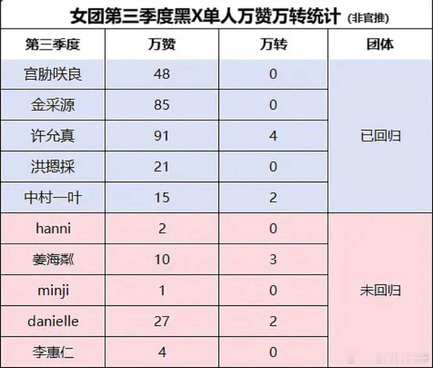 kpop五代女团第三季度推万赞万转数量排名柳智敏金玟庭giselle宁艺卓