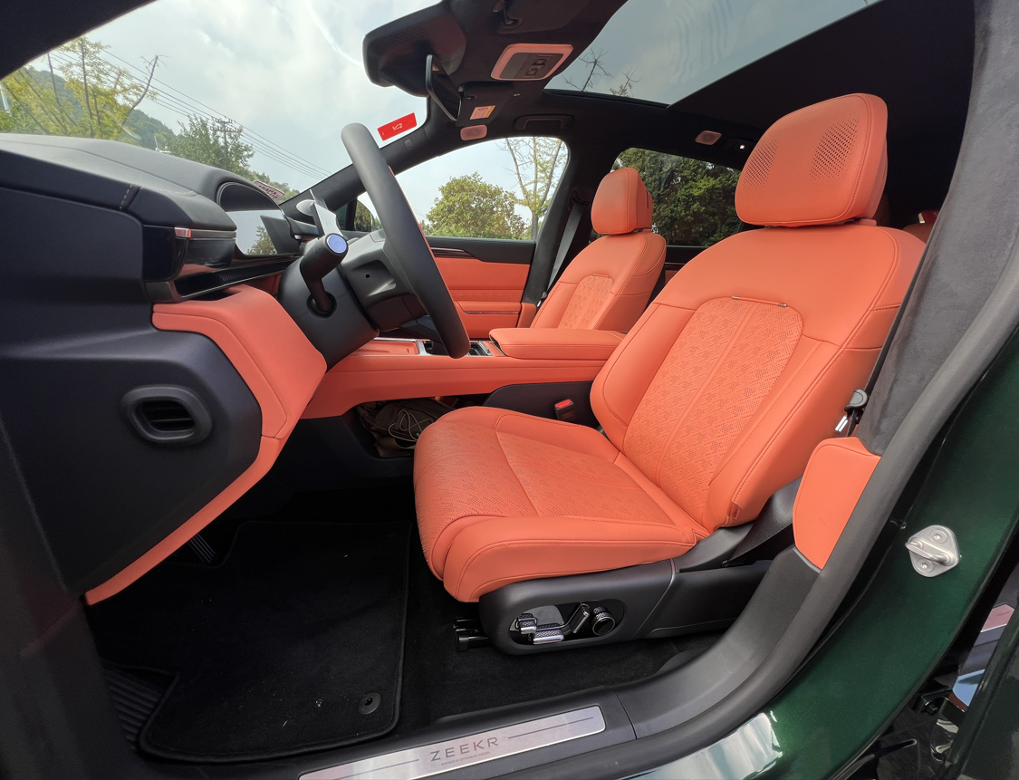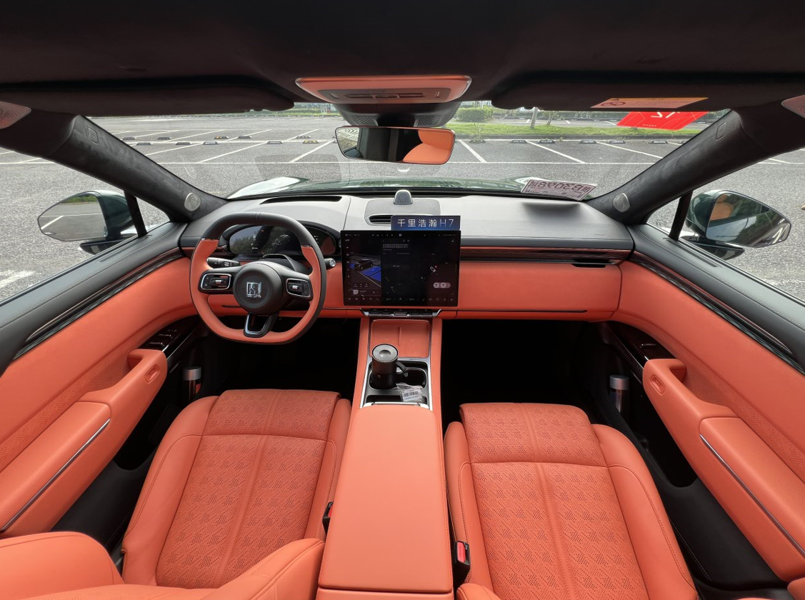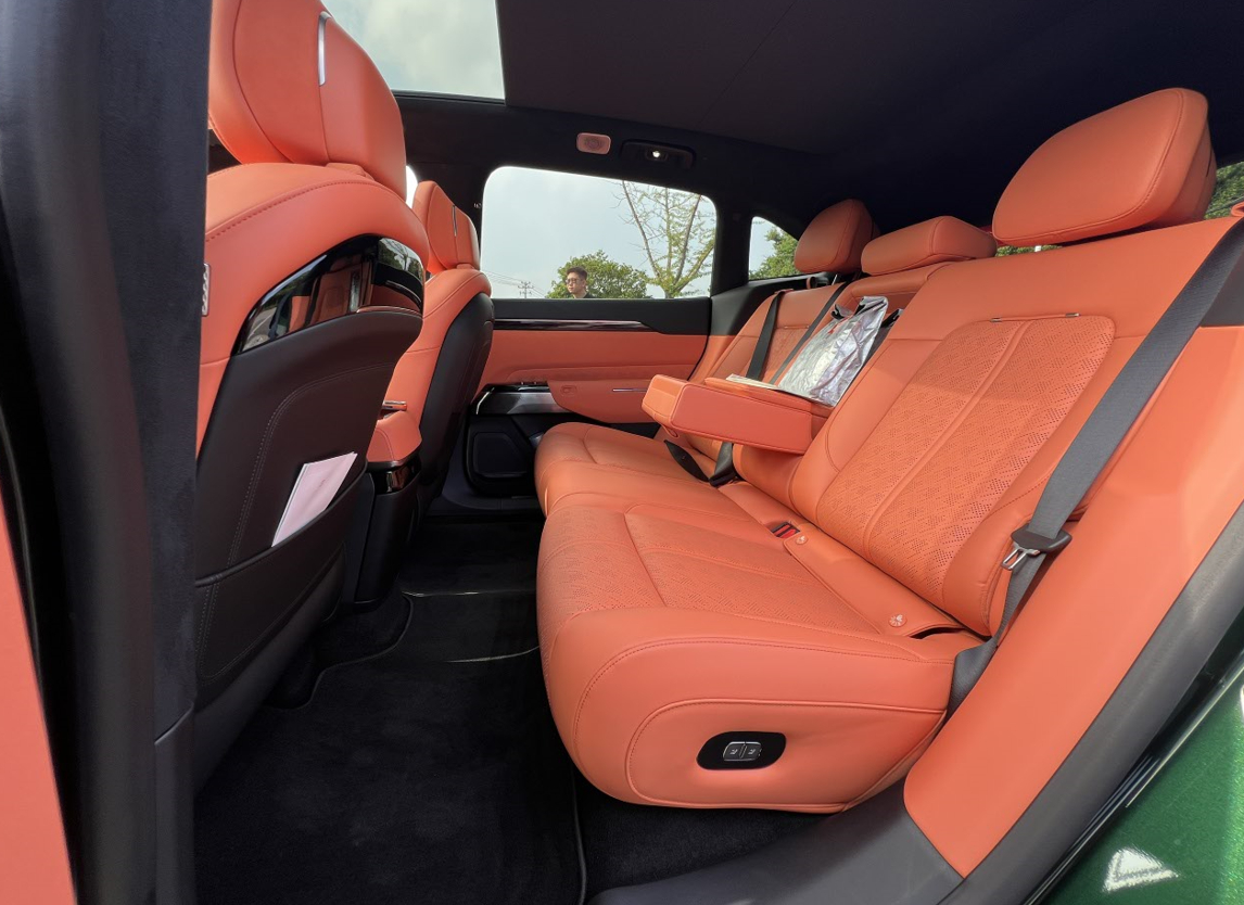 内饰新增了黑紫和黑橙两款配色,我们体验的黑橙配色有着破晓之光跃出深邃为科技注入耀眼活力,而黑紫配色夜幕之中极光流动尽显科技的深邃与神秘。并且顶棚包覆的麂皮绒采用了旗舰车型9X相同的麂皮绒料,而且在车窗上也采用了双层夹胶玻璃,提高了行车中的静谧性;