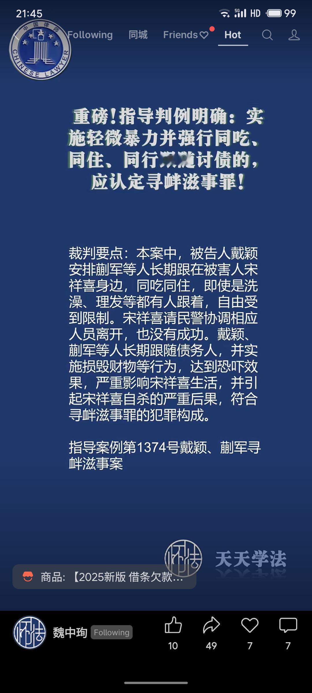 指导案例明确:为讨债而实施轻微暴力,并强行同吃、同住、同行跟随,长期限制他人自由,造成恐吓效果并引发严重后果的,依法应认定为寻衅滋事罪。