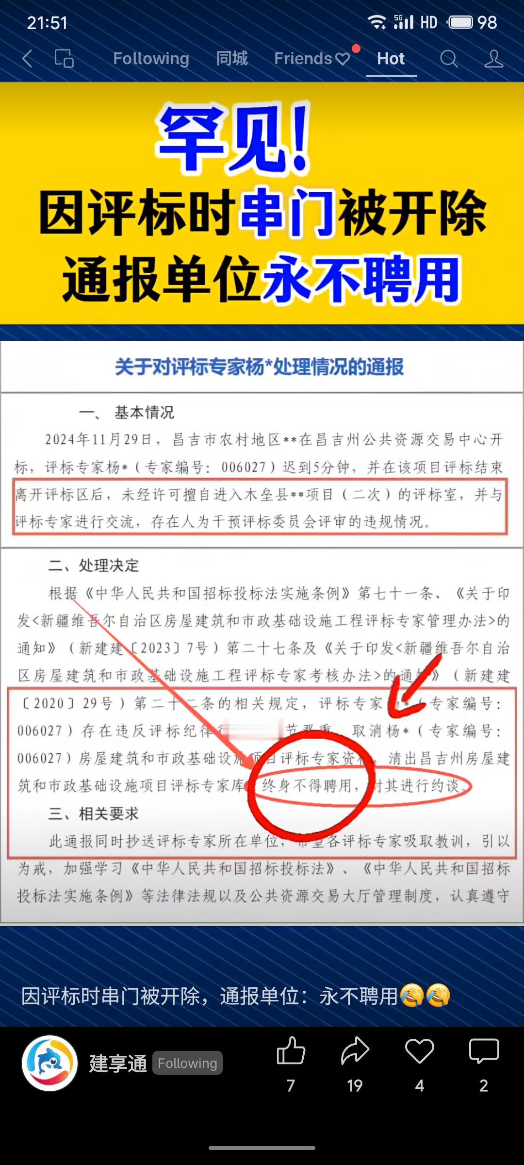 评标专家杨某在评标期间擅自串门交流,涉嫌干预评审,情节严重。现被取消专家资格,逐出专家库并终身禁入,以此警示他人严守评标纪律。