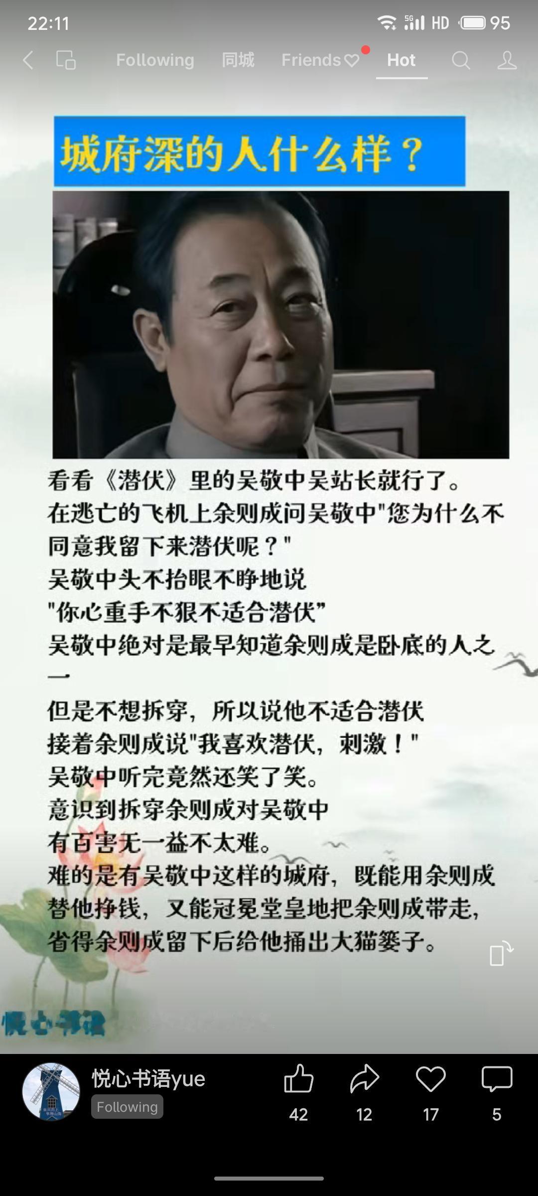吴敬中城府极深,早已察觉余则成是卧底却不点破。他以“心重手不狠”为由拒绝其潜伏,实则为己打算:既利用余则成敛财,又将其带离避免后患,权衡利弊,掌控全局。
