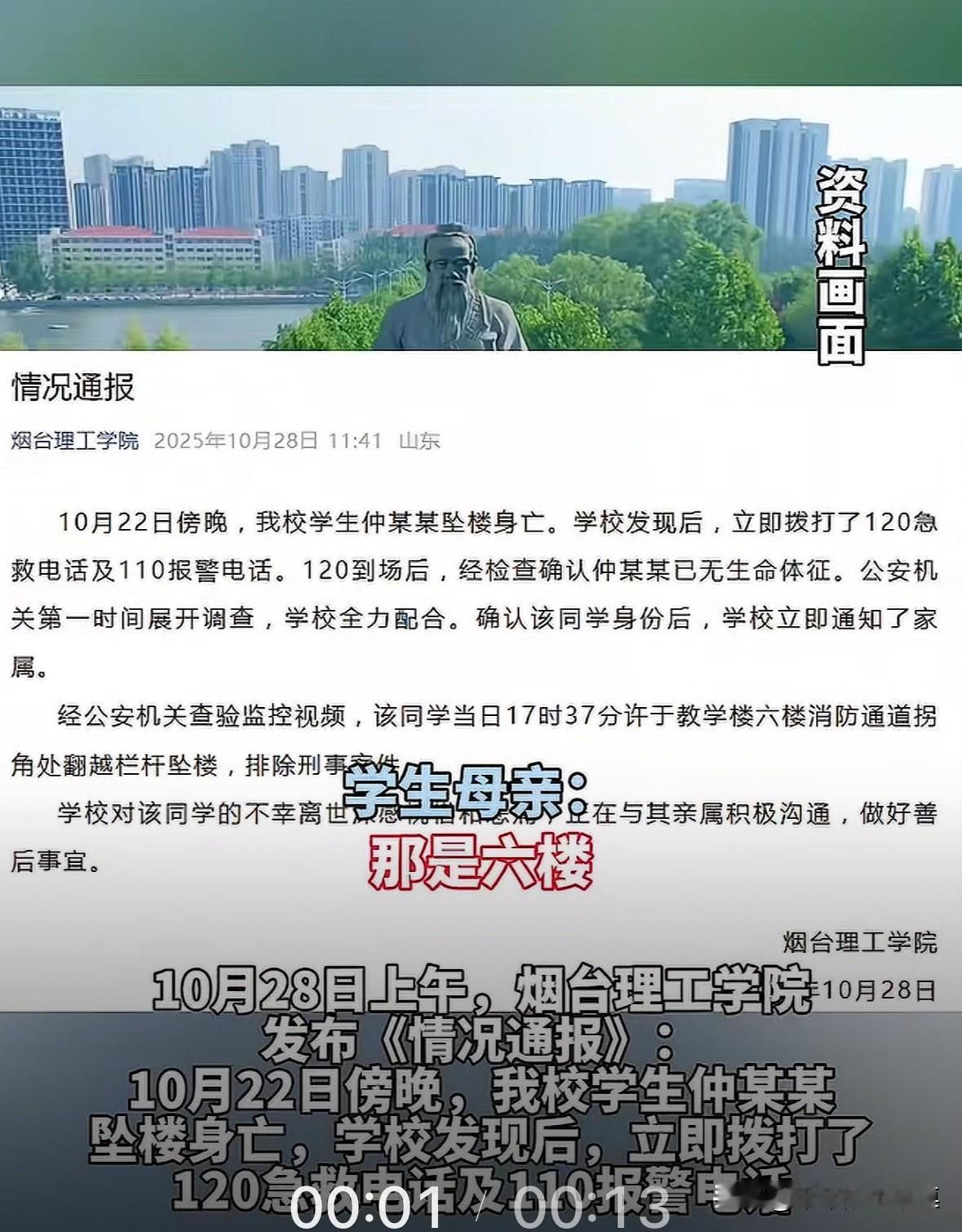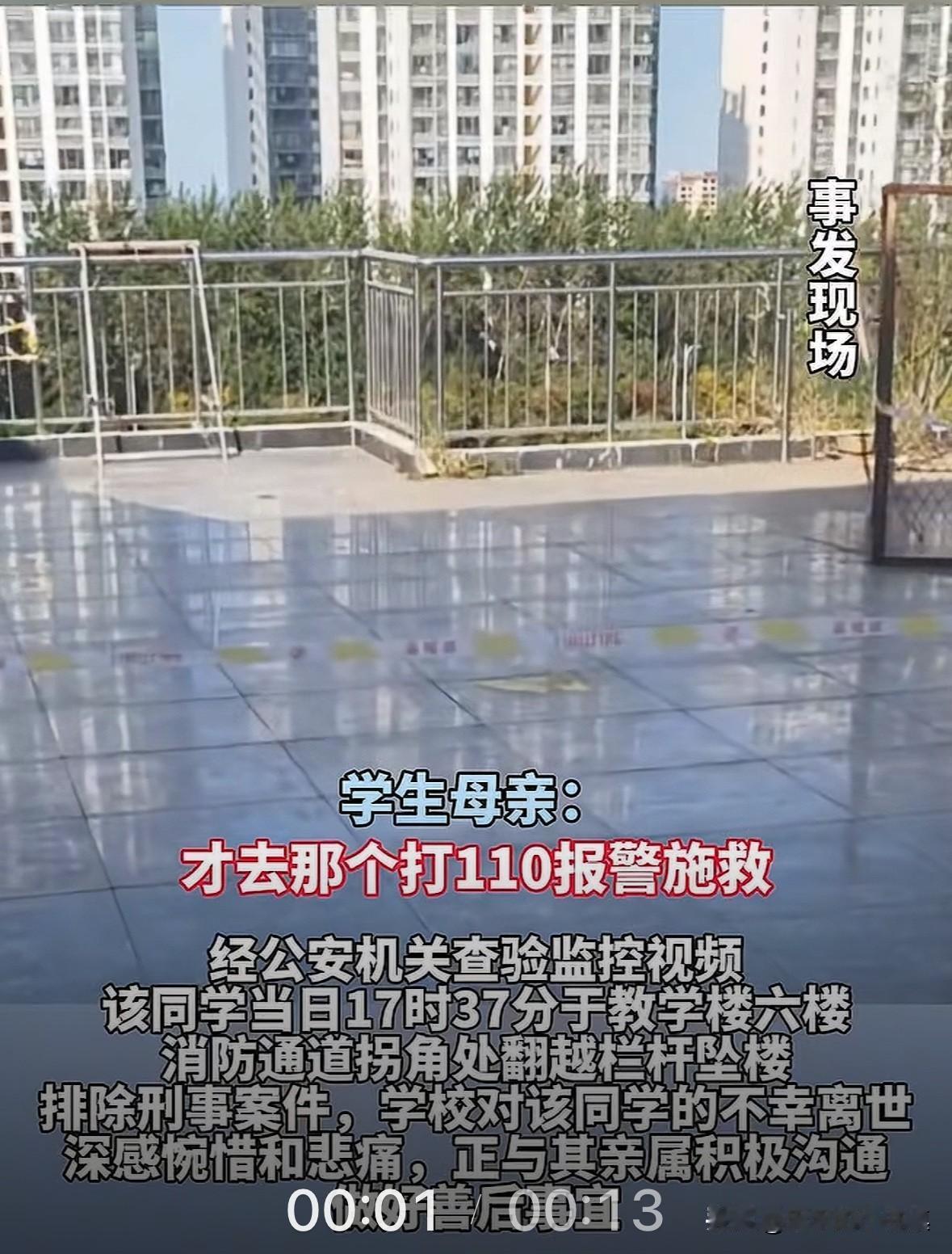 山东烟台一名女大学生坠楼身亡,学校通报:排除刑事案件! 据了解,这名女生下午课间时间在教学楼6楼消防通道拐角处,把腿抬到栏杆上,想活动一下腿,手抓住栏杆,不小心掉了下来! 学校监控只能拍到女生把腿抬到栏杆上,其他的都看不到。 过了71分钟后,有位同学经过才发现有人掉楼了,学校才叫来了120救护车,然而女生已经没有了生命体征。 这女生是怎么活动腿的,有栏杆还能掉下去?是不是学校的栏杆安全系数太低? 学校同学说:“如果这女生身高在165-170之间,栏杆正好到女生的胸部了,不可能自己掉下去!” 还有人说,这女生有抑郁症。 反正说什么的都有,就是因为摄像头没拍到。 学校表明态度:没有任何刑事案件,愿意退还两年的学费,并且赔偿10万块钱。 家属不依不饶,认为事发后,学校71分钟后才叫来救护车,错过了最佳抢救时间! 而且护栏边上也没有警示牌!女孩坠楼现场 学生坠楼