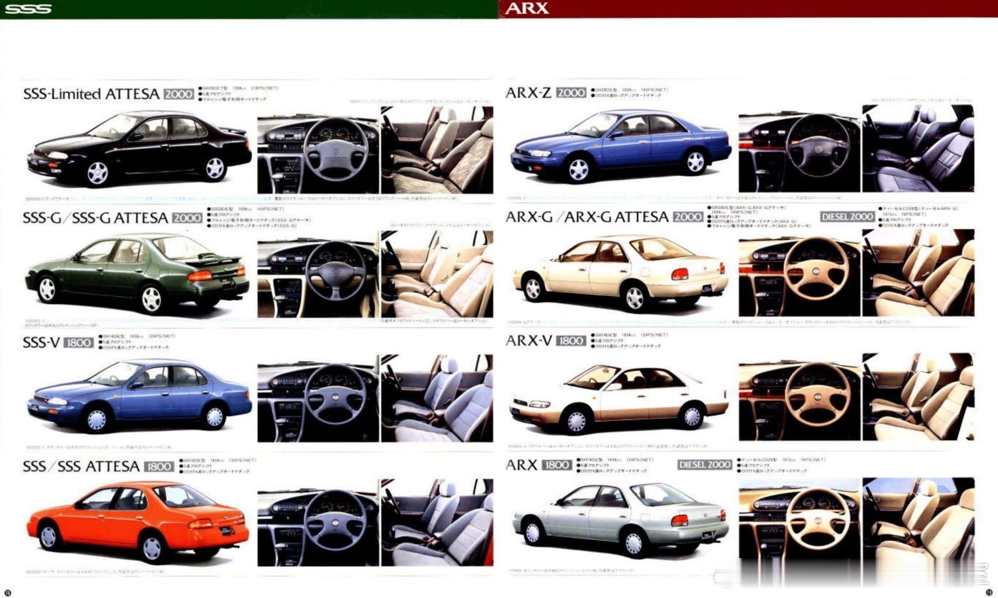 • 区别:SSS系列(Super Sport Sedan)主打运动性能,有1800SSS和2000SSS等版本,分别搭载1.8升SR18DE(125马力)和2.0升SR20DE(145马力)发动机,匹配4AT或5MT变速箱,部分高配车型还配备四驱系统和后轮转向功能。ARX系列是四门硬顶车型,更注重外观的优雅和独特性,动力系统与SSS系列部分车型相同,但在配置上可能会更偏向豪华舒适,如顶级的ARX-Z版本标配真皮座椅。