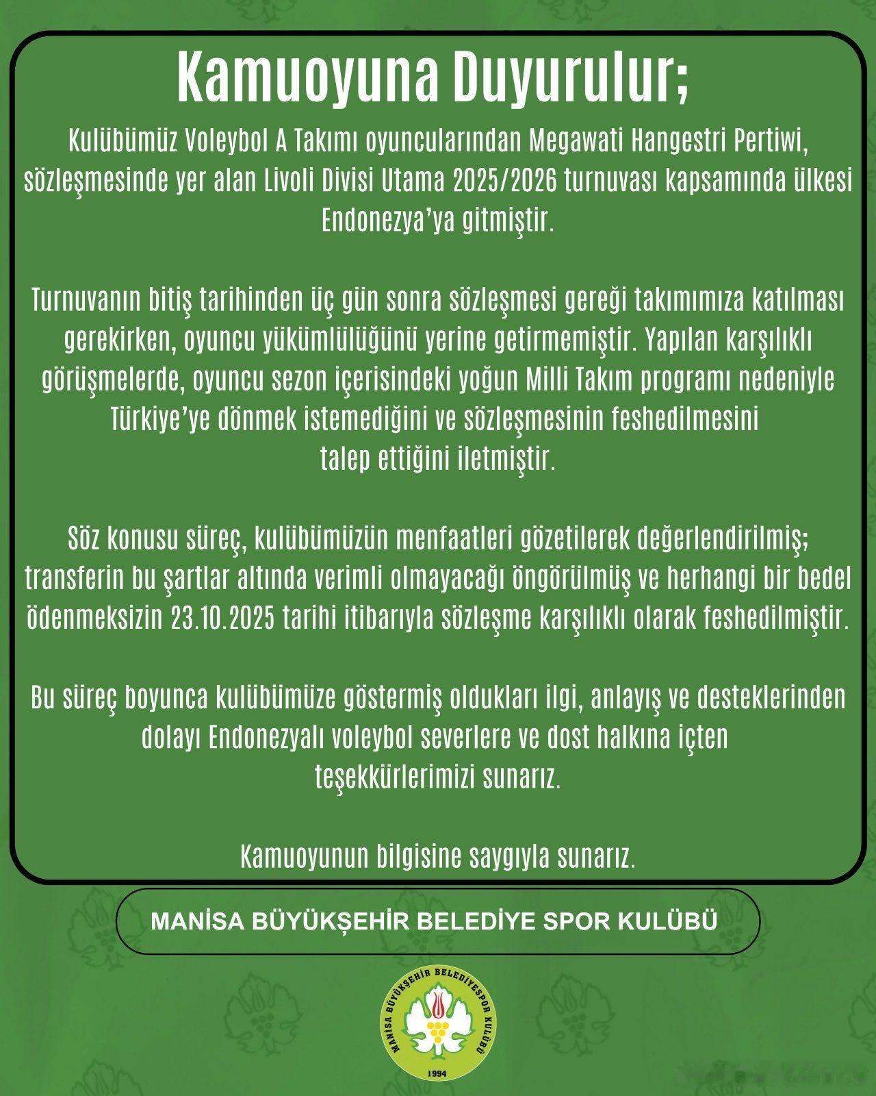 ❌ 🇹🇷 土耳其甲级联赛俱乐部马尼萨已与🇮🇩 印尼一姐——梅加瓦蒂·汉格斯特里·佩尔蒂维 (Megawati Hangestri Pertiwi) 解除了合同。