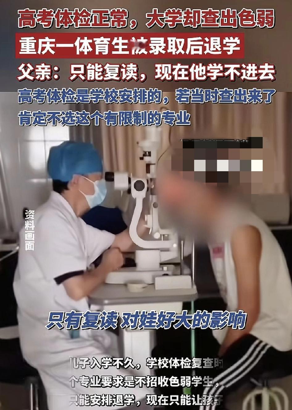 重庆一位大一的学生在一次学校组织的体检当中检出色弱,该学生的专业是体育运动康复专业,对于社觉方面有要求,由于体检不合格,所以学校也不能给学生安排转专业,只能办理退学,学生的父亲专门到省考试院去查了高考的体检资料,显示色觉是正常的。现在孩子只能回去复读,但是学不进,影响非常大。这种情况把责任推向学生与家长是令其最无助的,为什么当初提高考体检的医院没有责任,从另一个角度让学生转对色觉没有要求。的专业是不是也可以行得通。