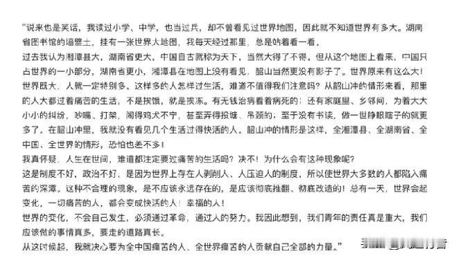 毛泽东主席的初心是什么?这可以从他第一次看到世界地图时的心理活动中找到答案。 你还记得你第一次看到世界地图时内心的感受吗?反正我是什么都不记得了,因为当时除了新奇、感慨世界之大外,再也没有多余的想法了。一代伟人却不是这样的。 1912年秋天,19岁的毛泽东在长沙省立湖南省图书馆看到了一幅《世界坤舆大地图》。这是毛泽东第一次看到世界地图,给了他带来强烈的心灵震撼:世界如此之大,该有多少痛苦的人!从此便下定为全中国、全世界痛苦的人贡献自己全部力量的决心。这可能就是毛泽东的初心吧。