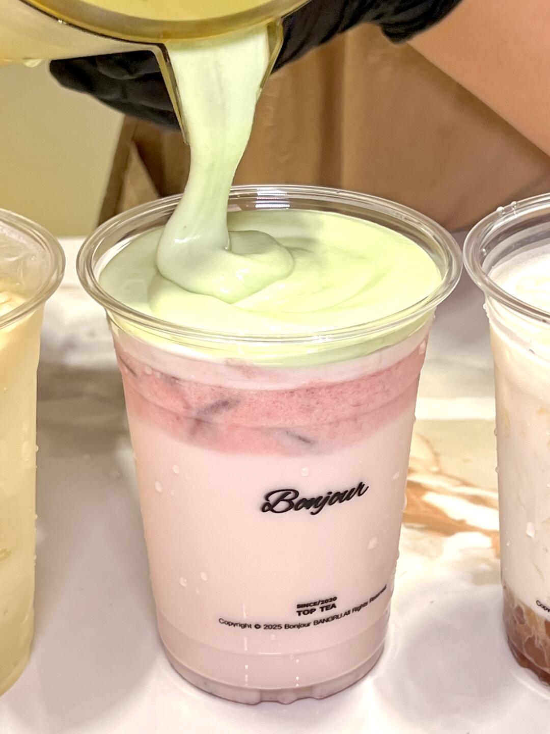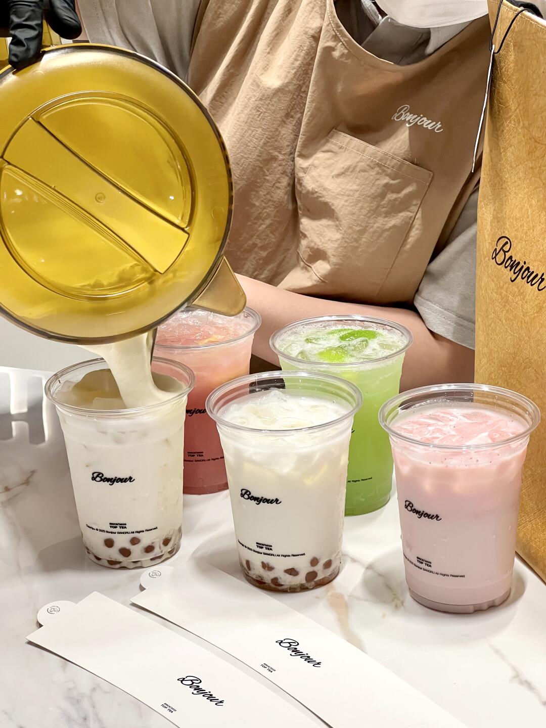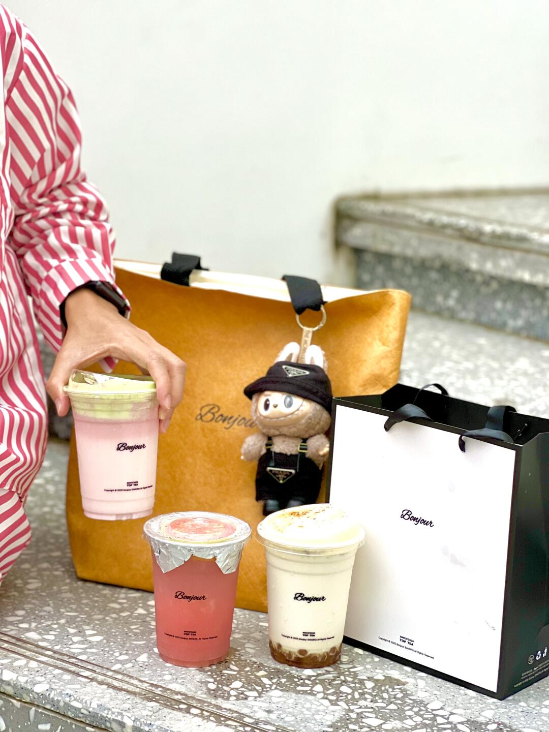 来了,他来了,他终于来了! 心心念念的BONJOUR本就奶茶开来南宁万象了! 📝记得第一次喝他是2023年在苏州十全街! 念念不忘,然后在上海,在泉州疯狂外卖,不愧是奶茶界的🐎爱马仕! · ☁️招牌【浮云鲜牛乳】闭眼冲! 🎟ta家颜值和味道并存的【蓬巴杜粉莓】我称之为“猛男芭比粉”真香!🏋🏻♀️ 🍋【芭乐柠檬茶】也很清新,好喝 我说ta好喝就是真的好喝! ·