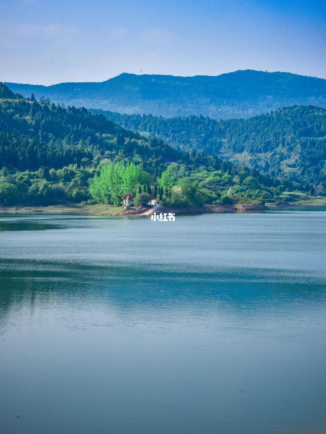 面积宽阔的水库,蓝绿色的湖水和青山树林形成了一幅风景画卷