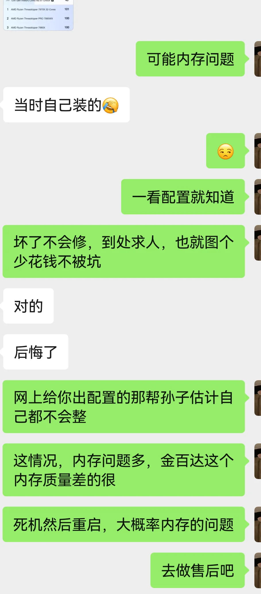 买电脑的时候都是这个奸商那个奸商,不信这个不信那个,找人买的,找人帮装的,回头还骂我一句奸商,还觉得我多挣钱,那你电脑出问题了自己花钱找人不就行了,还来问我干嘛?东西又不是找我买的,找谁买你问谁不就行了?????是不是觉得我这修电脑不收费还不瞎说,买前觉得贵,出问题需要花钱了就开始想白嫖了??请自重好嘛??或者请出费用再找我维修。。。图里是哥们的哥们,帮忙的,但是,里可不少自己买出问题找我问我的,,我又没挣你的钱,谁挣你的钱找谁售后,,帮装那么良心,请他们免费解决,他们已经挣了你钱了,,是不是有些帮装不搭理你啊?是不是装死啊?是不是人都找不到了???多正常啊。。。。一个个黑我喷我奸商的那么多,怎么就没一个找过我装机的出来避雷我这不好那不好呢??你们这些黑我的倒是找出来一个啊??是不是找不出来啊??就你们这些黑子这水平,也就只会网上造谣了。