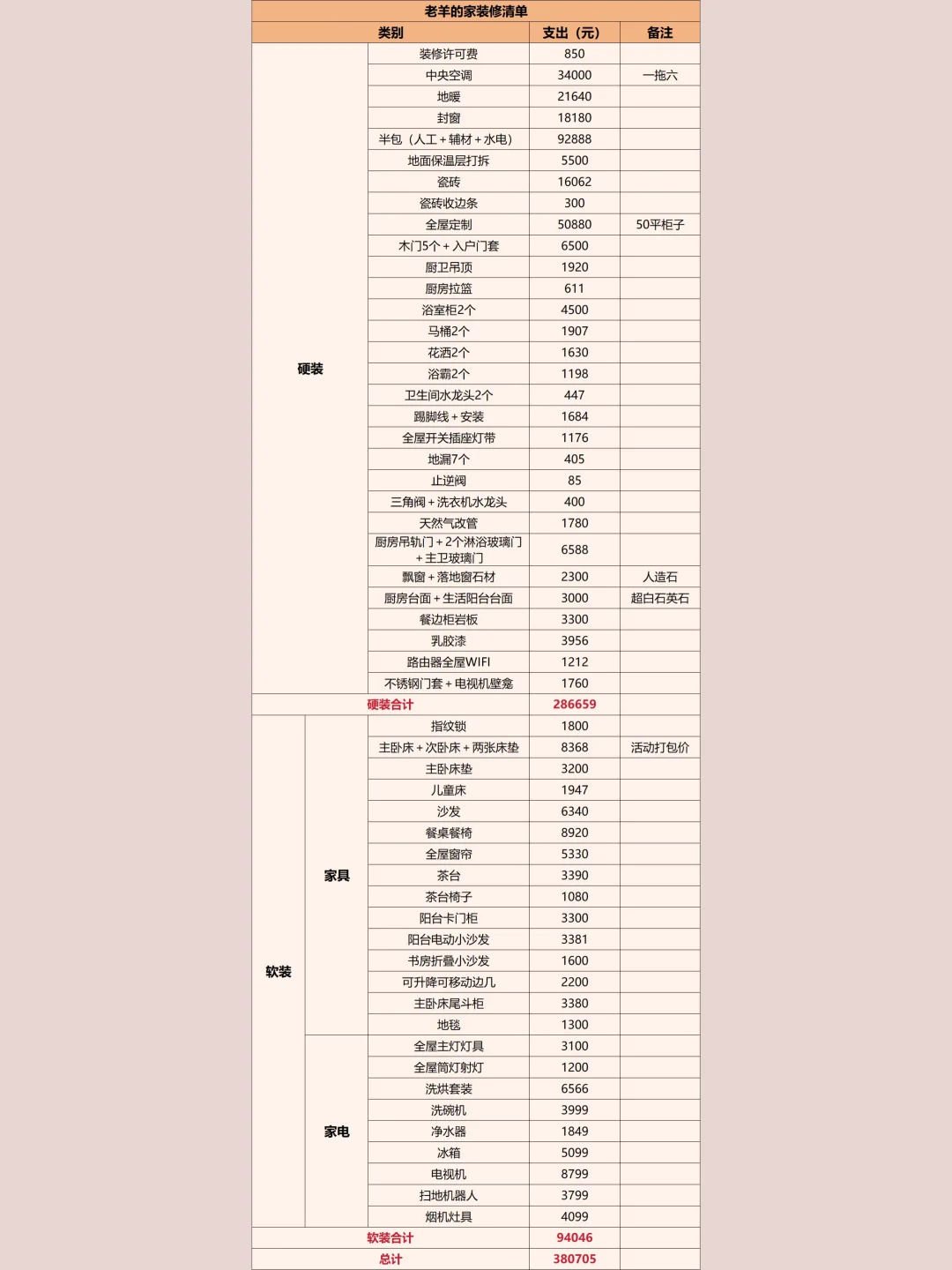 2.需要控制预算的,装修前做好细致的预算表,把误差控制在3W内。预算不能凭空想也不能光参考别人,确定好装修风格之后,尽量细致到每一项去做详细预算表。我当时是按照【设计费、半包、全屋主材、厨房、卫生间、阳台、家具、家电、杂项】等几大类来做的预算,每一大类再细化到每样需要的东西。不清楚价格水平的,没事就多跑跑建材市场,家居馆,这样预算才能贴近实际。