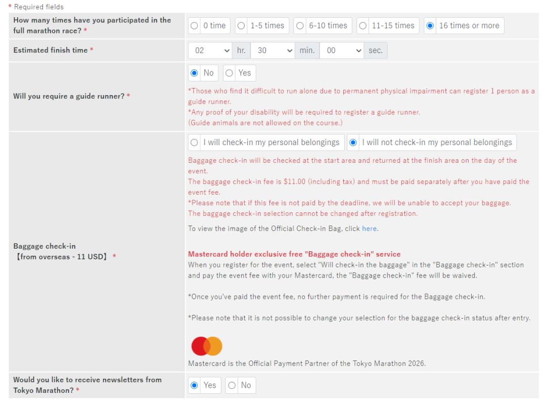第十步:选择完赛马拉松的次数、预计完赛时间、是否需要引导员,一般不要,是否需要行李托运,这些选完后点击下一步