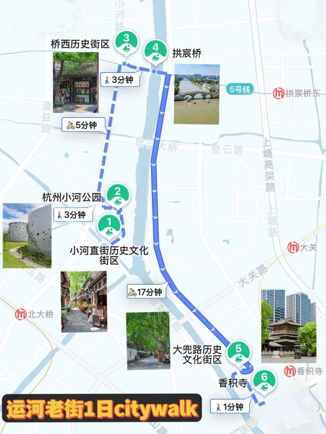 小河直街→小河公园→桥西历史文化街区→拱宸桥→大兜路→香积寺
