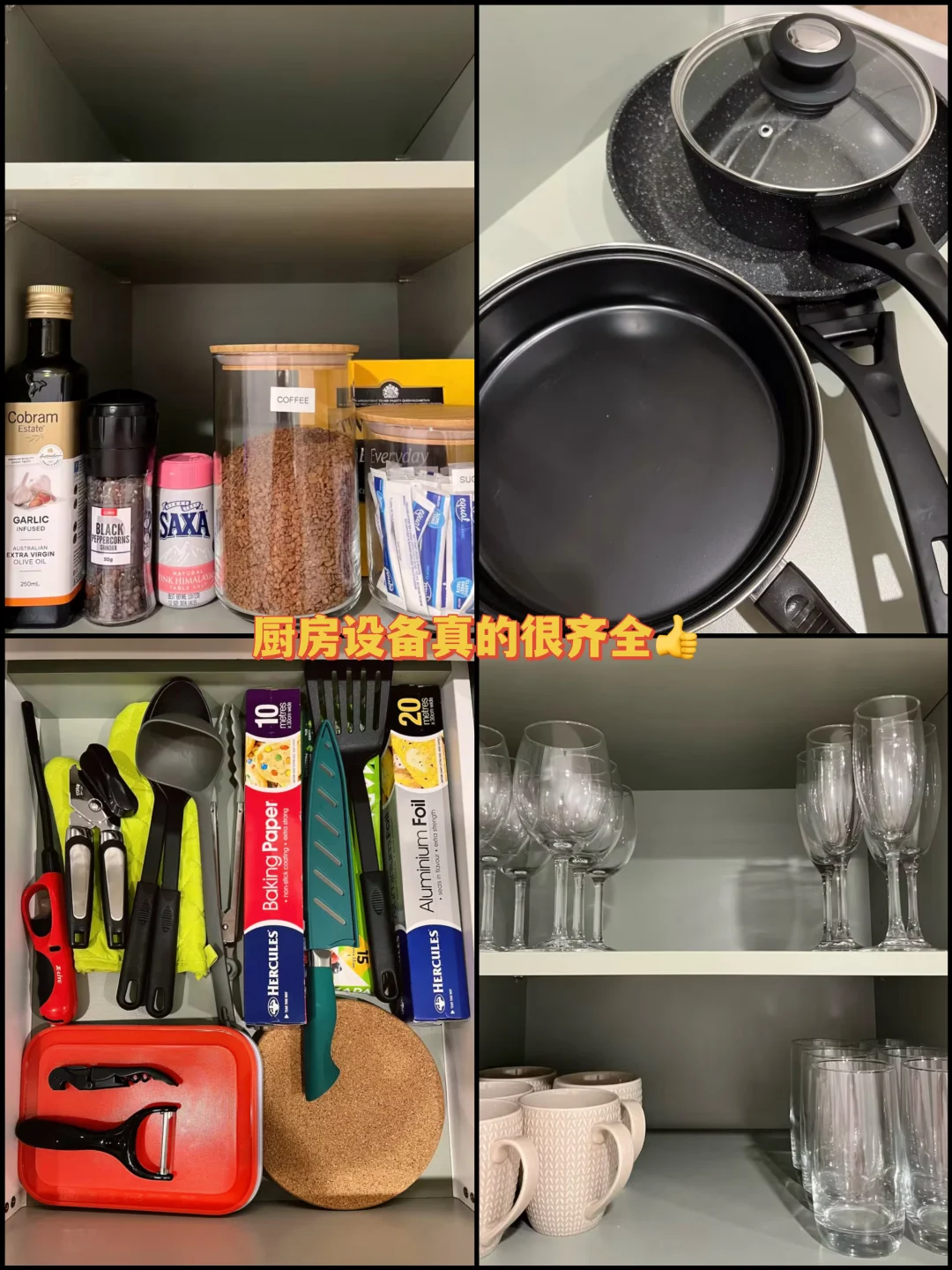 厨房各种锅具、餐具一应俱全,调料也很丰富。一家人一起动手做饭,品尝自己烹饪的美食,温馨又惬意🥂